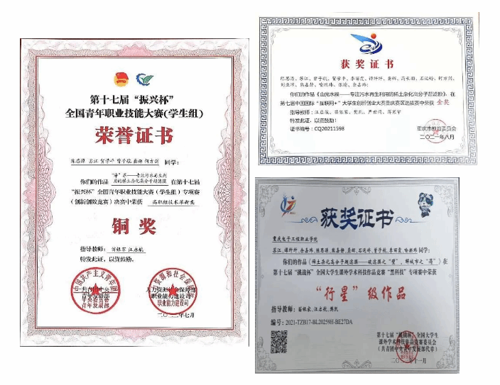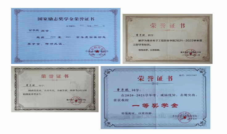 她通过自身的努力以及老师的鼓励,求学十余年至今,尤其是重电的三年求学,让她明白了校训“厚德强能、求实创新”的育人理念,完成了从懵懂初识到知行并进的华丽蜕变。在校期间,积极参加各类比赛,参与了第七/八届中国国际“互联网+”大学生创新创业大赛、“挑战杯”中国大学生创业计划竞赛、渝创渝新、振兴杯等各类竞赛十余次,累计获得 2 次国家级奖项,10 余次市级荣誉,并斩获了第八届中国国际“互联网+“大学生创新创业大赛金奖。