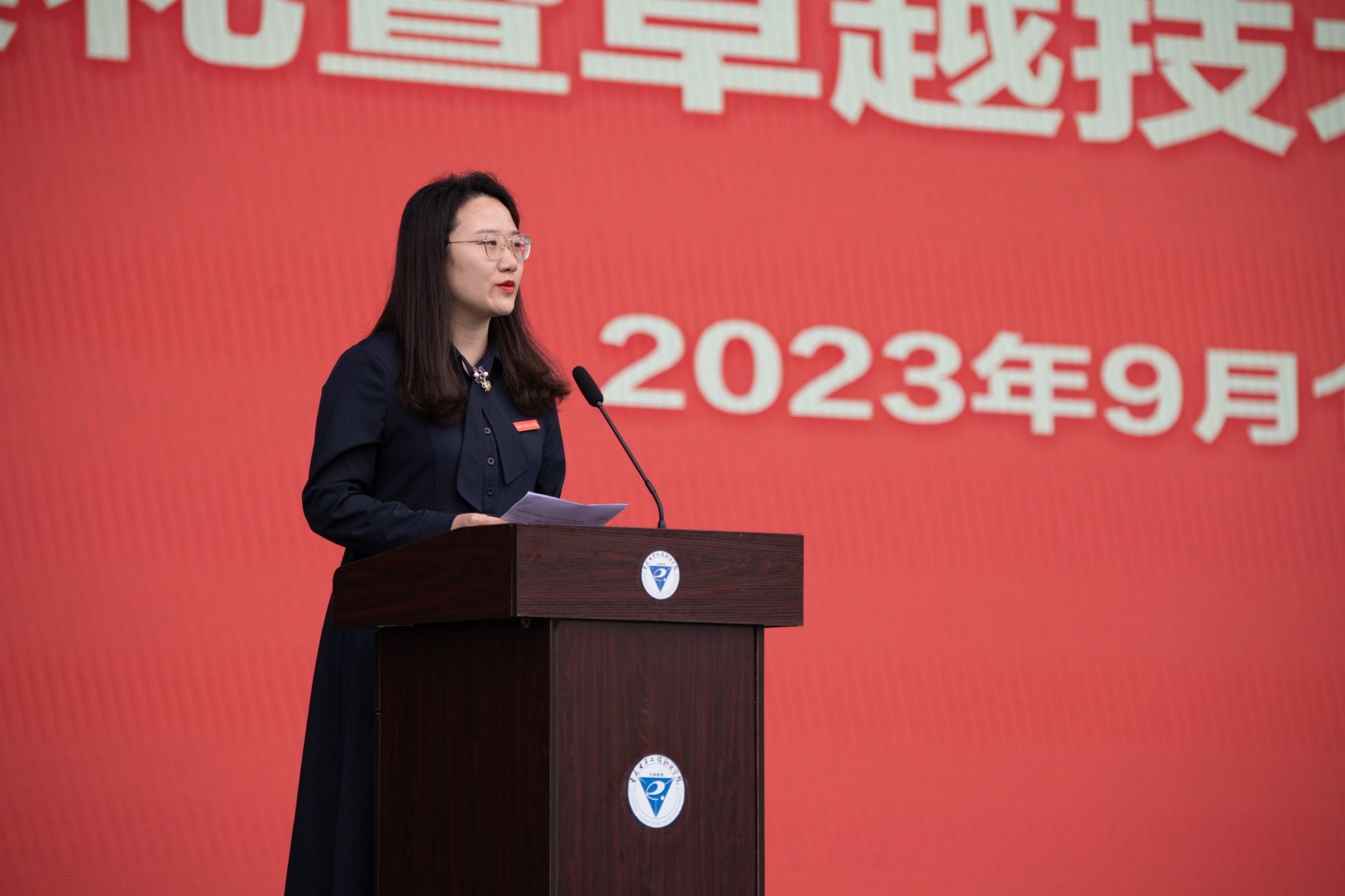 为增强2023级学生的集体荣誉感和归属感,在本次开训仪式暨开学典礼中,由主席台全体校领导为2023级新生代表佩戴校徽。