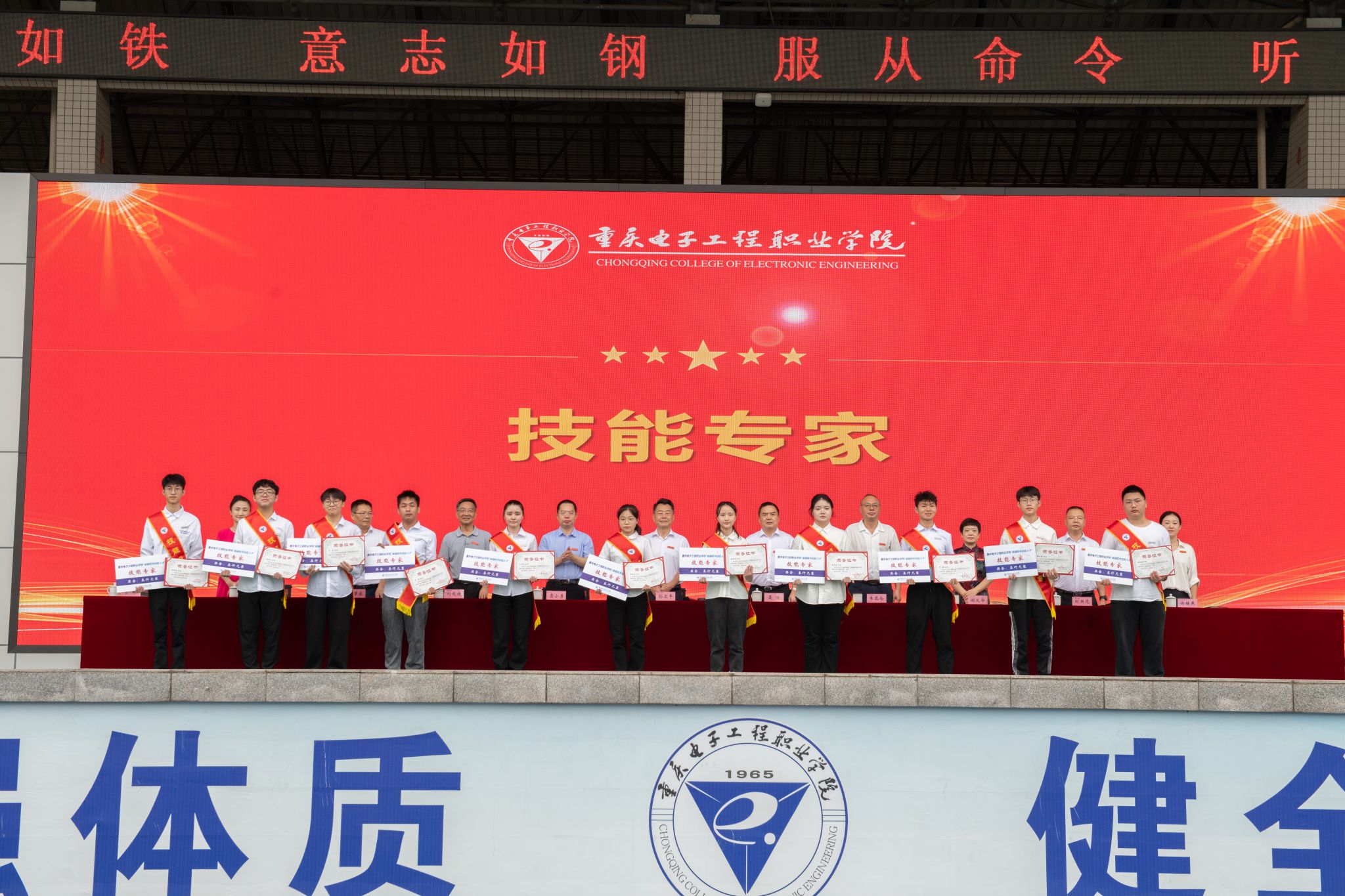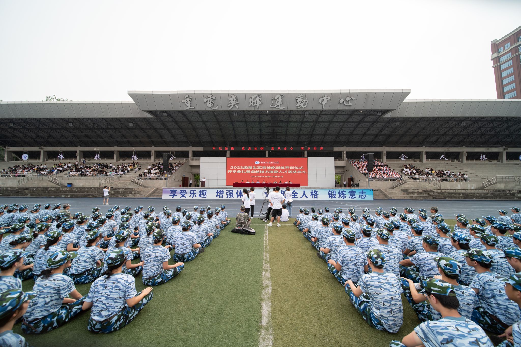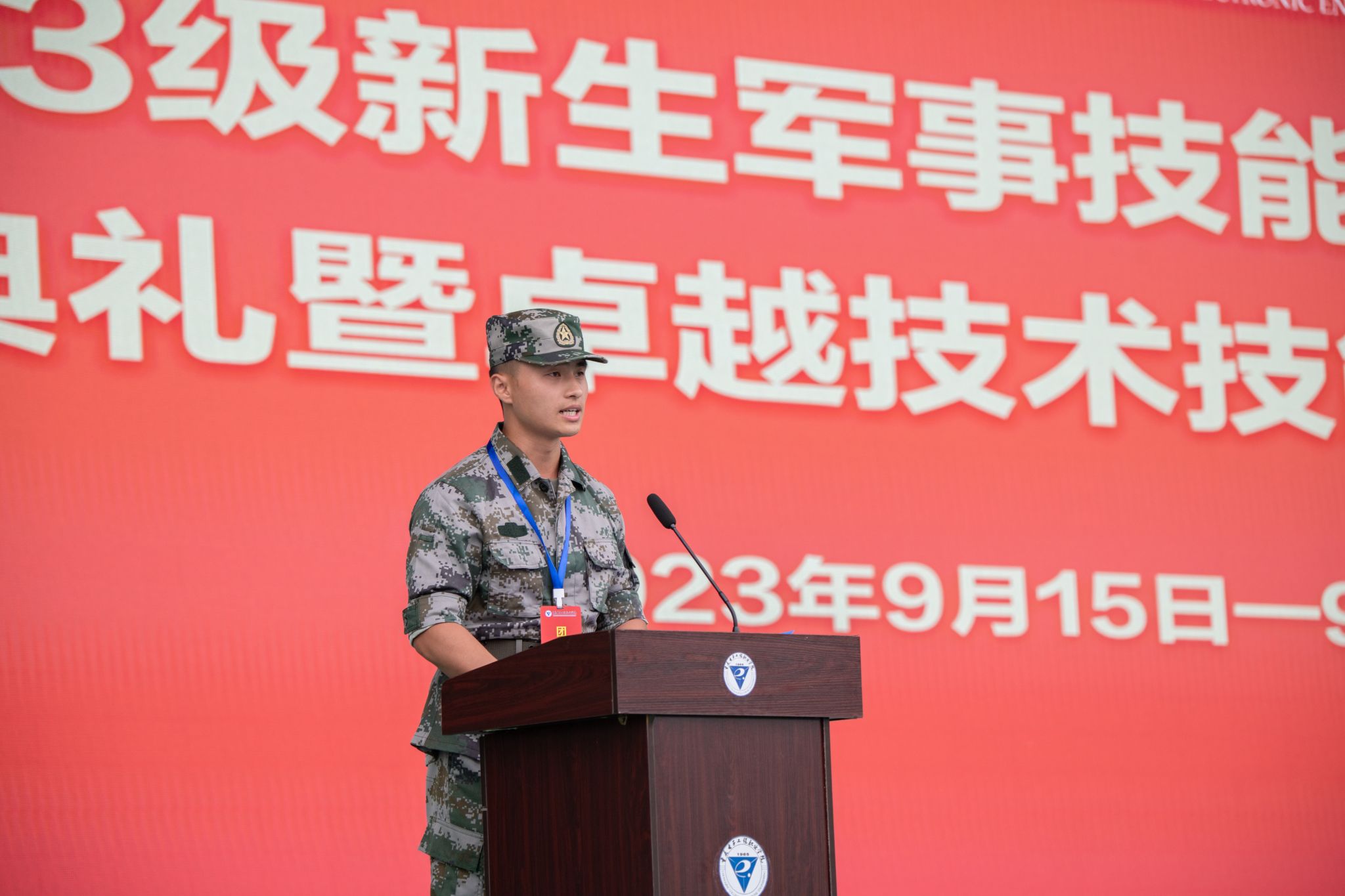 2023年9月18日上午,我校2023级军事技能训练开训仪式、开学典礼暨“卓越技术技能人才”颁奖典礼在重电奕晖运动场举行。学校全体校领导,中国人民解放军重庆市沙坪坝区人民武装部领导及官兵,各职能部门负责人及二级学院书记、院长、学管科长、新生辅导员,重庆电子工程职业学院2023级新生参加了典礼活动。大会由党委副书记龚小勇主持。