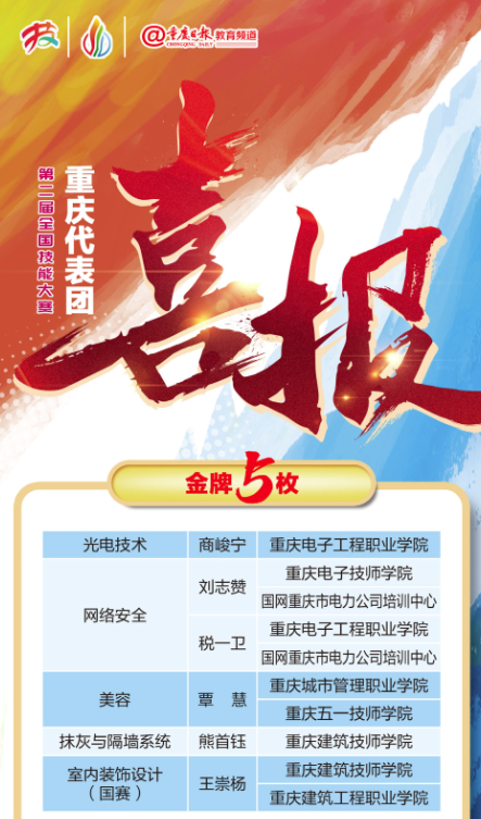 重庆代表团共派出135名选手参加103个项目比赛,比技术、比状态、比精神,最终获得5金2银4铜和67个项目优胜,金牌总数位居西部第一。我校此次共参加了8个项目的比赛,勇夺2金和4个项目优胜奖,金牌数并列重庆第一。巴渝工匠、闪耀津门,充分展示出重庆技能人才队伍建设成果和技能竞赛水平。