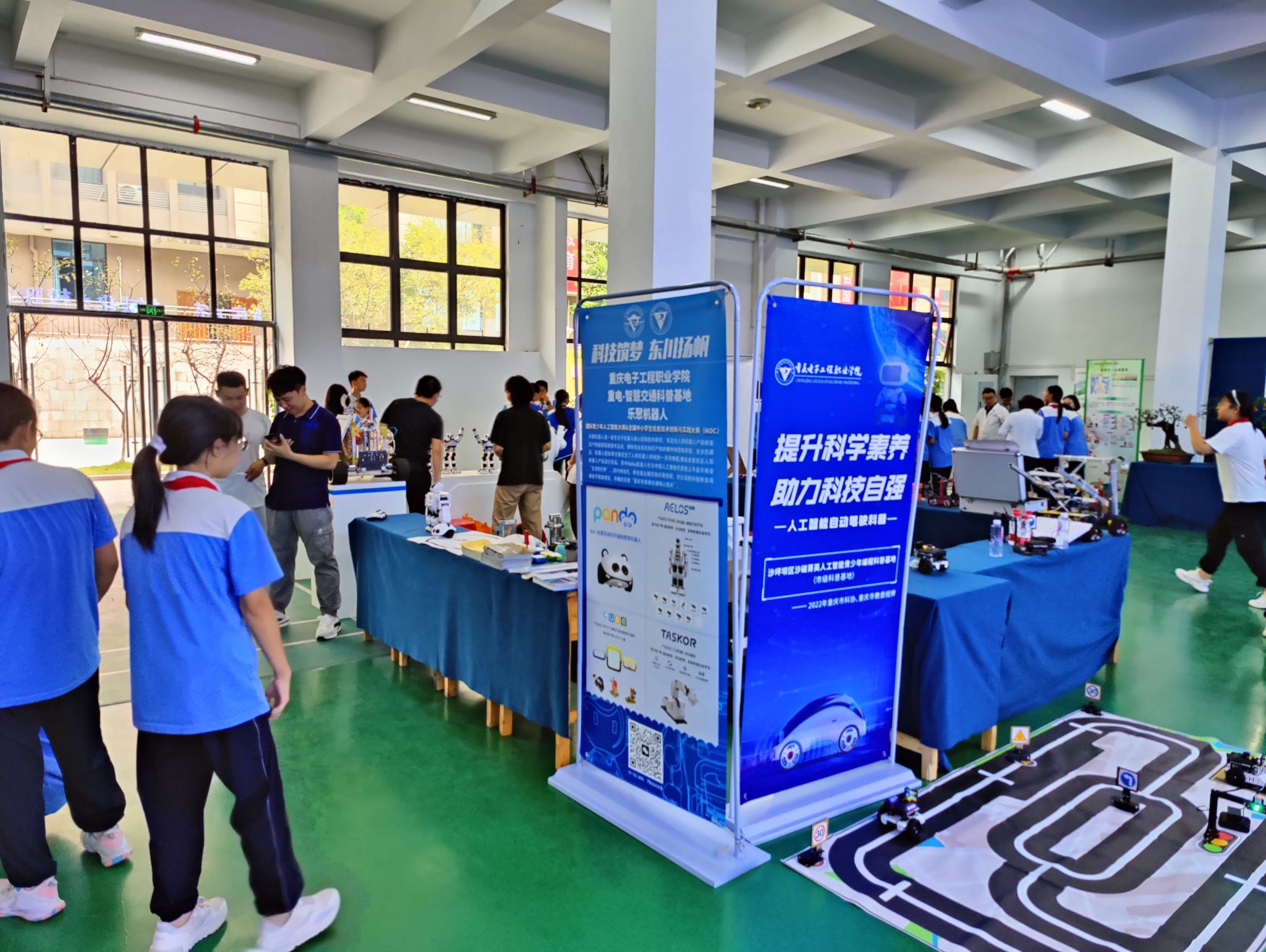 启动仪式后,科研与社会服务处组织了重庆市科普基地(智慧健康学院牵头建设)、第二批科普重庆共建基地(人工智能与大数据学院牵头建设)工作人员携二十余件机器人为广大师生带来了一场内容丰富、形式多样的科普体验活动,让同学们在参观与互动体验中感受科技的魅力。
