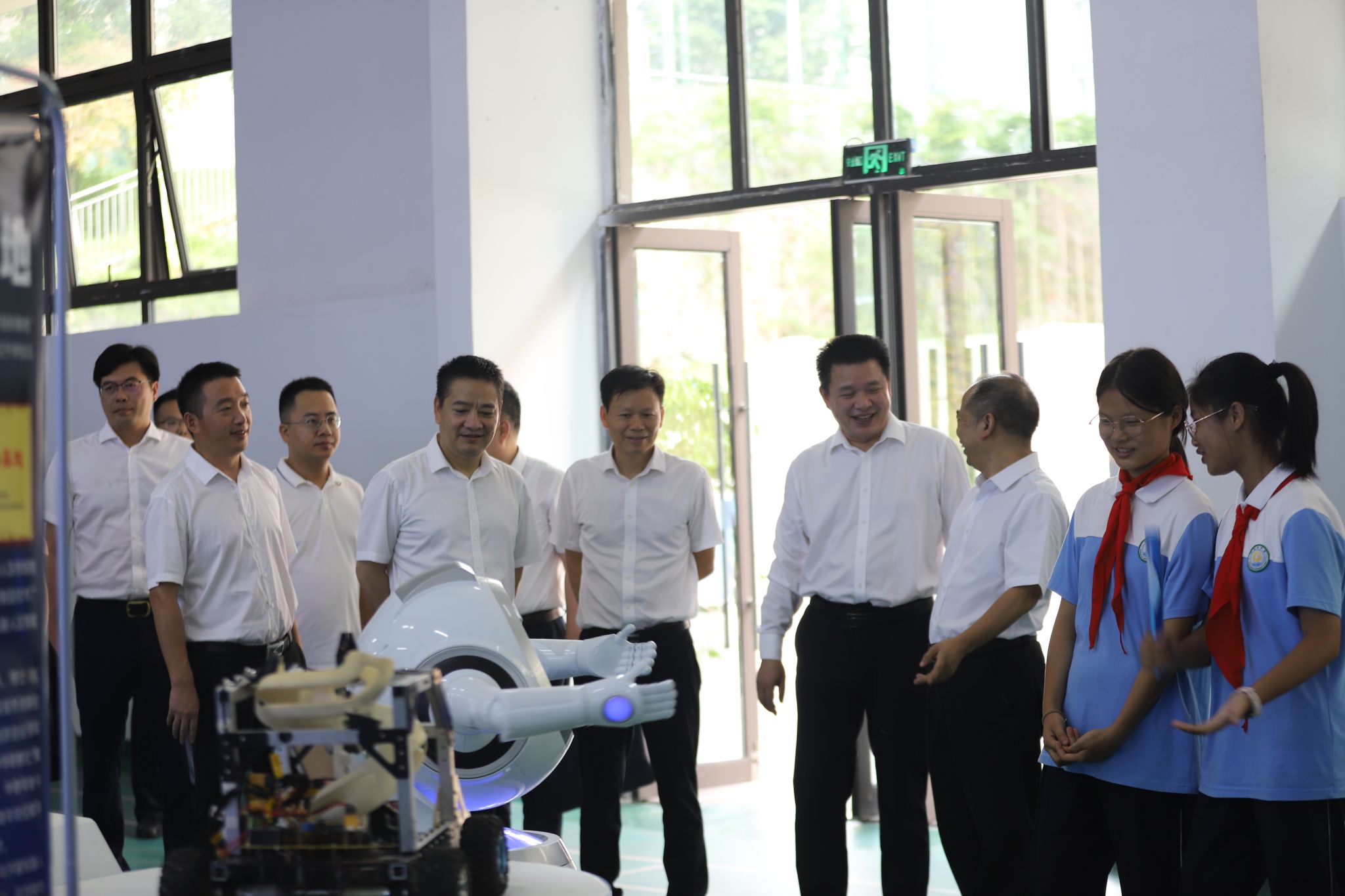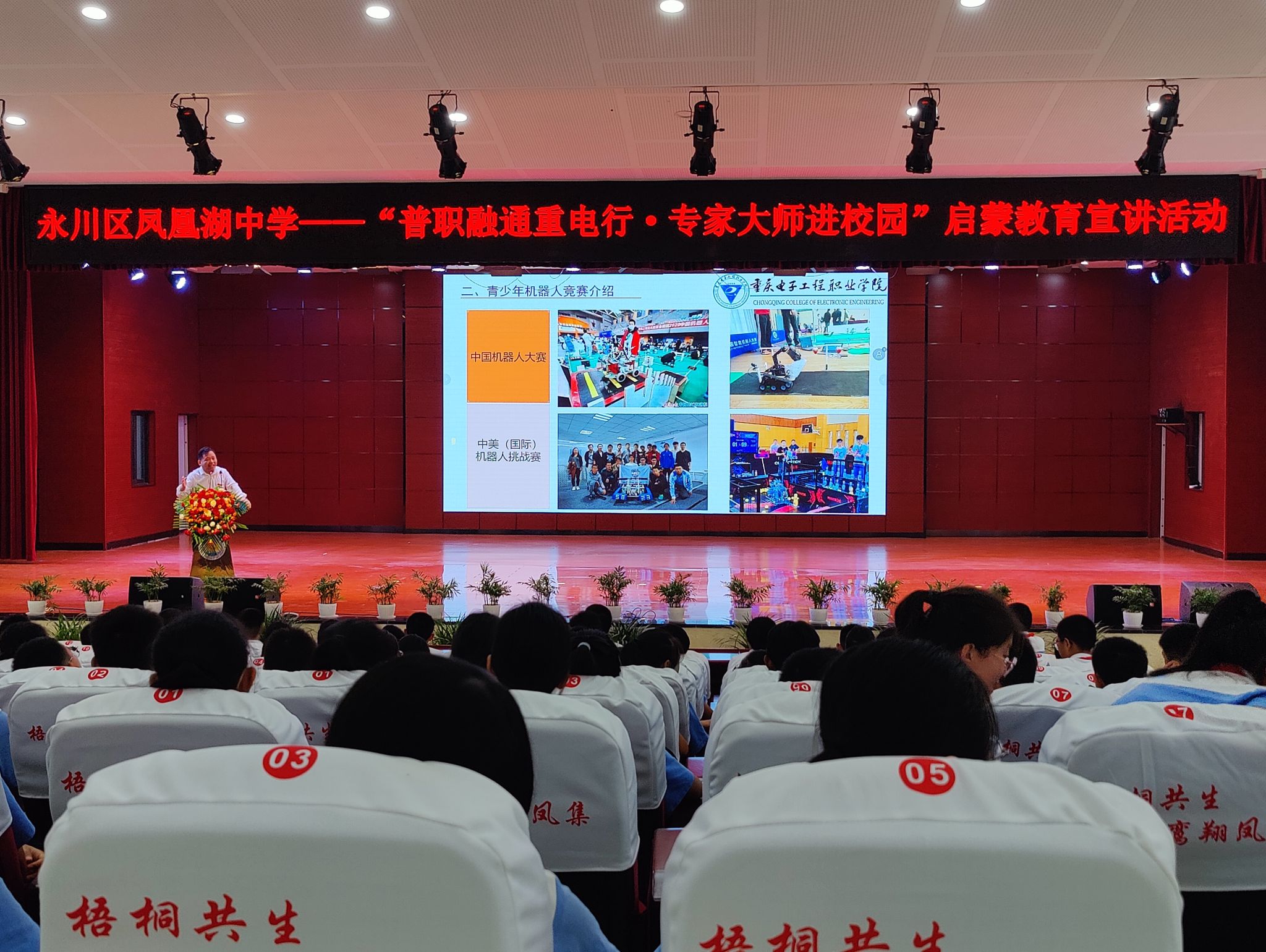 9月18日上午,2023年永川区全国科普日活动启动仪式在凤凰湖中学举行,启动仪式在简单热烈的氛围中拉开序幕。重庆市科协党组成员、副主席谭明星,重庆市科协科技服务中心党总支书记、主任郑吉安,永川区委副书记蔡焘,永川区委常委、区政府副区长、永川高新区党工委书记宋文,永川区人大常委会副主任孔萍,永川区政协副主席漆远英,学校党委委员、副校长黄爱明等出席启动仪式,区级相关部门、校相关二级单位参加。启动仪式上,黄爱明受邀为重庆电子工程职业学院职业启蒙教育基地(永川中学、凤凰湖中学、北山中学、上游小学、兴龙湖小学、红河小学)授牌。智慧健康学院赵鹏举教授向凤凰湖中学师生作了题为《智能机器人发展与青少年科技创新能力培养》的专题职业启蒙科普讲座。