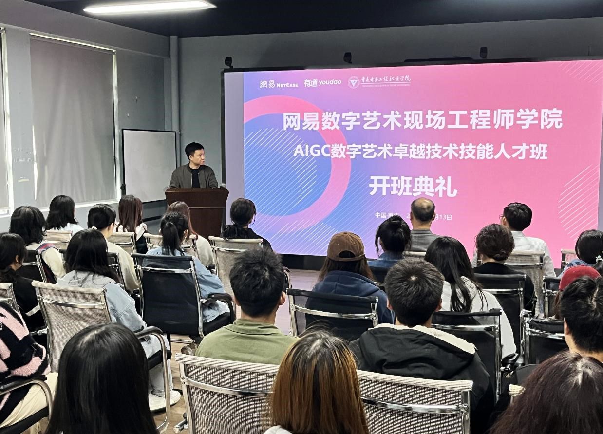 2023年10月13日由数字媒体学院联合网易共建的网易数字艺术现场工程师学院AIGC数字艺术卓越技术技能人才班开班仪式在数字媒体学院1107数字艺术工作室举行。重庆电子工程职业学院数字媒体学院院长刘晓东,网易数字艺术现场工程师学院负责人罗坚,网易有道产教融合总监李飞,网易有道产教融合西南区经理梅林出席了开班仪式。