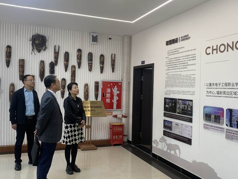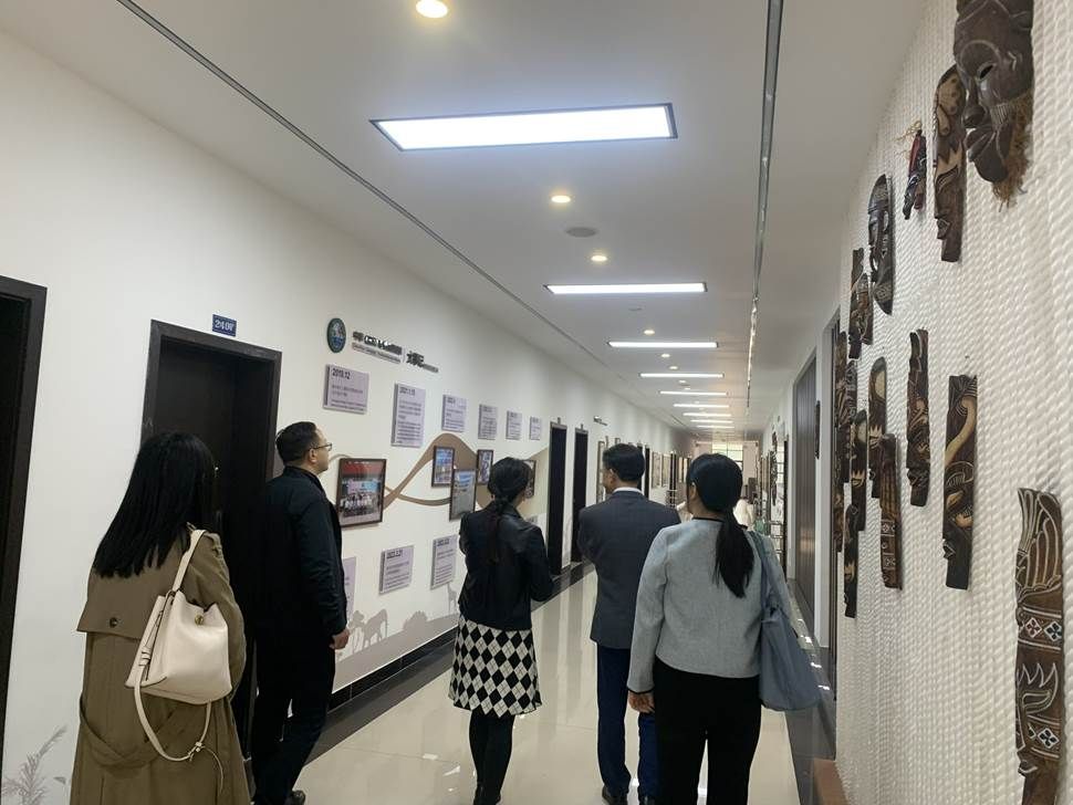 专家组一行人首先实地参观了我校国际学院国学馆、中非(重庆)合作交流中心等场馆,实地了解学校建设基础。