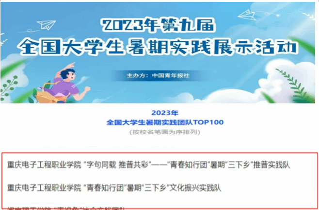 11月10日,中国青年报公布了2023年第九届全国大学生暑期实践展示活动结果,智能制造与汽车学院“字句同载 推普共彩”——“青春知行团”暑期“三下乡”推普实践队以及“青春知行团”暑期“三下乡”文化振兴实践队成功入选全国大学生暑期社会实践百强团队,是重庆市高职学院仅有的两支入选团队。