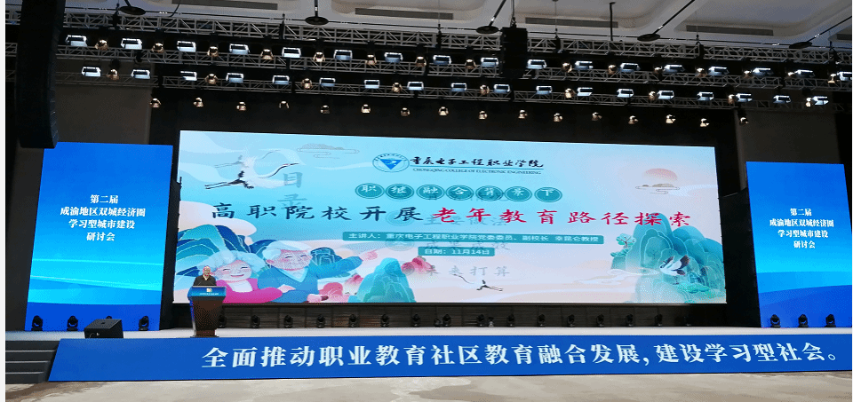 在第二届成渝地区双城经济圈学习型城市建设研讨会上,我校副校长幸昆仑教授作为重庆高职院校唯一代表就“职继融合”背景下高职院校开展老年教育路径探索进行发言。他提到我校高度重视社区教育老年教育工作,已将该工作纳入了学校发展规划,我校不断推动职业教育与继续教育协同发展,已建立“学校、二级学院、系部”的三级纵向推进机制和“学校+社区学院”“学院+街道”“系部+社区”纵横协作机制。探索形成了“双建设、双服务、双提升”老年教育新路径,着力构建校社联动、院街互动和立体推动的老年教育新局面。