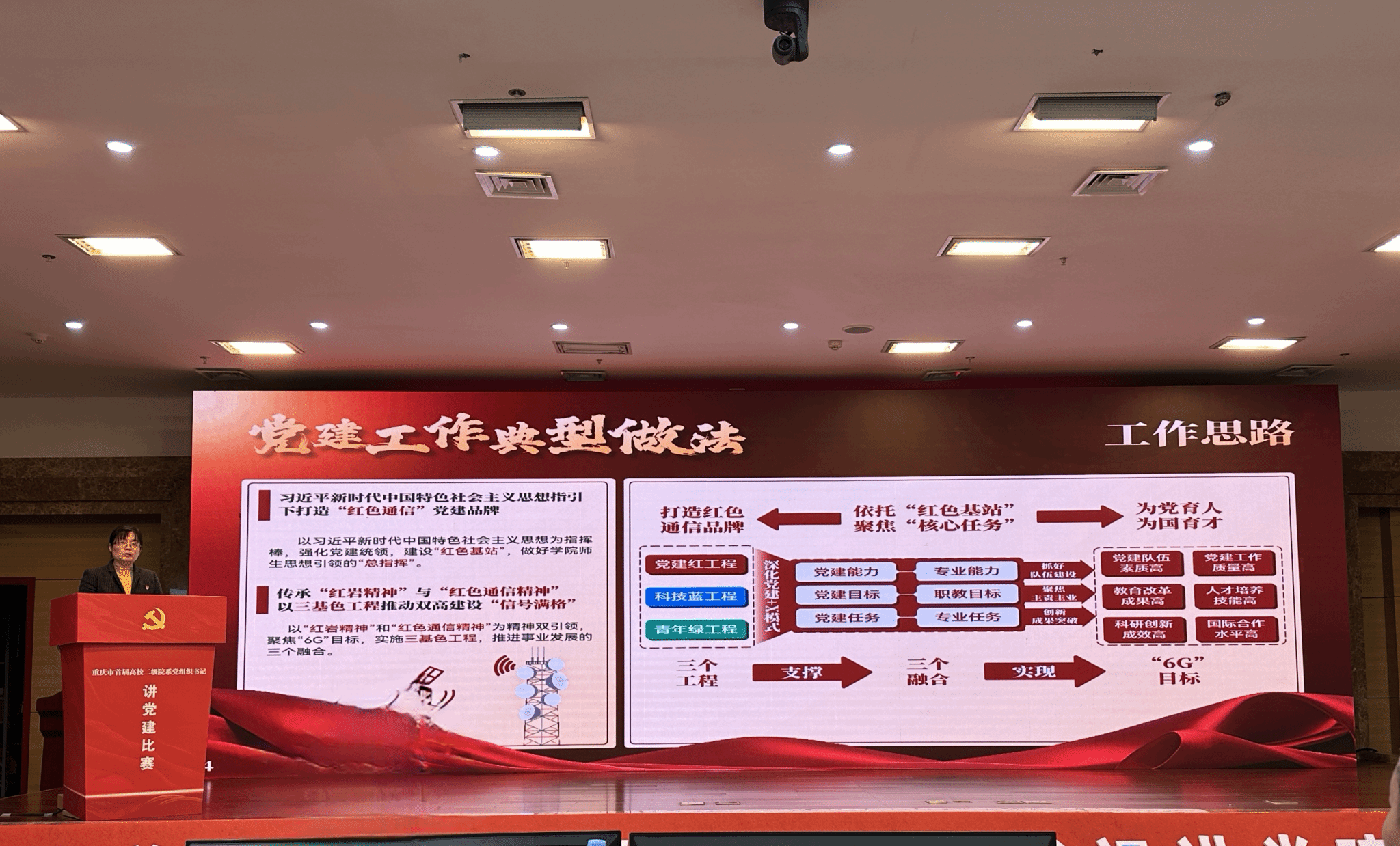 现场展示中,曾晓宏同志以打造“红色通信”党建品牌、推动双高建设“信号满格”为主题。紧紧围绕深入学习贯彻习近平总书记关于党的建设的重要思想这一主线,聚焦为党育人、为国育才的核心任务,结合学院党总支“红色通信”特色党建品牌,通过实施“三基色”工程,推进党建能力与专业能力、党建目标与职教目标、党建任务与专业任务三个融合,从而实现党建队伍素质高、党建阵地质量高、教育改革成果高、星空(中国)技能高、科研创新成效高、国际合作水平高的“6G目标”的党建工作新格局。曾晓宏同志以国家“双高计划”建设学院抓牢党建的视角,充分展示了我校打造具有“重电”辨识度的“党建品牌”的实践历程,以及高质量党建统领事业高质量发展取得的成绩与经验。