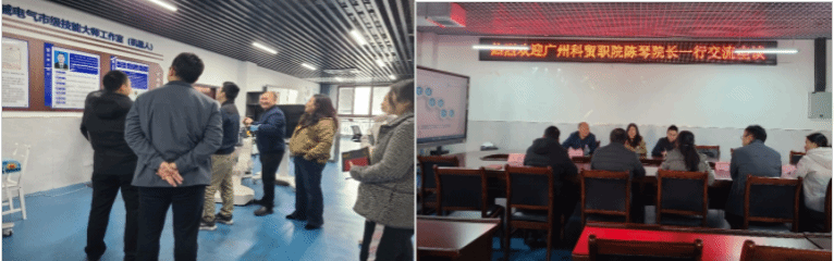 2023年12月5日,广州科技贸易职业学院生物技术与健康学院院长陈琴一行三人莅临智慧健康学院开展考察交流。智慧健康学院副院长李卉主持接待并座谈,学院党总支书记罗永前、医康设备系负责人及骨干教师参与了本次调研交流。