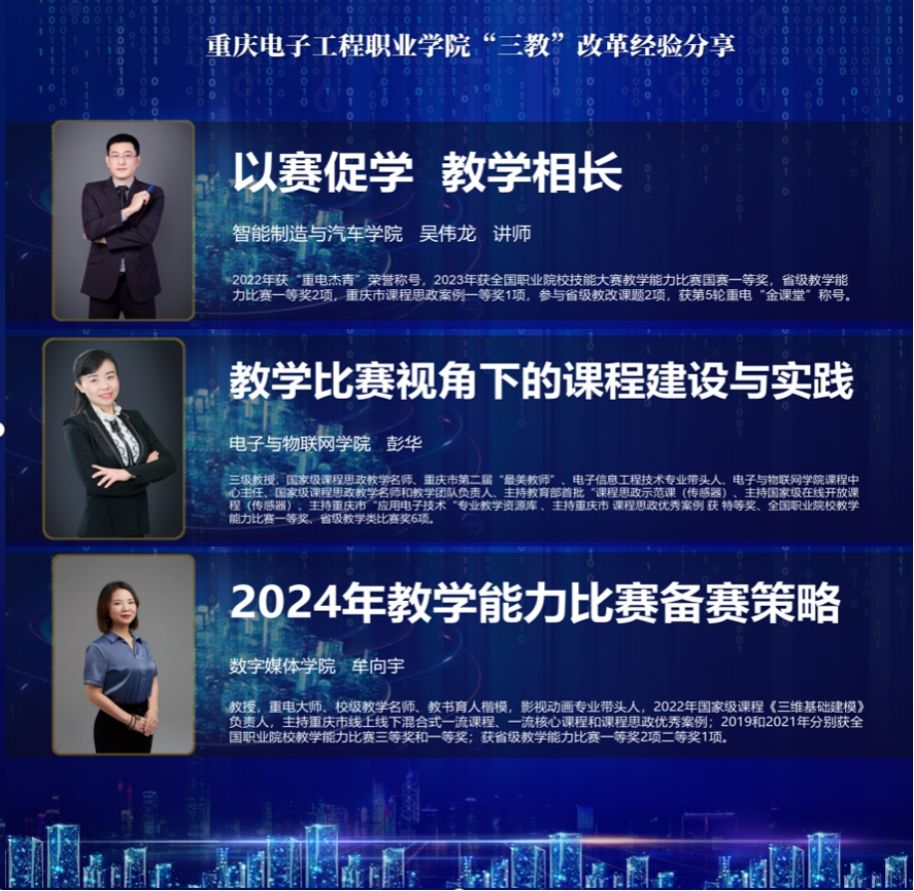 本次活动邀请了2023年全国职业院校技能大赛教学能力比赛一等奖获得者吴伟龙,2023年全国职业院校技能大赛教学能力比赛一等奖获得者、国家级在线精品课程主持人彭华,2021年全国职业院校技能大赛教学能力比赛一等奖获得者、国家级在线精品课程主持人牟向宇老师进行分享。