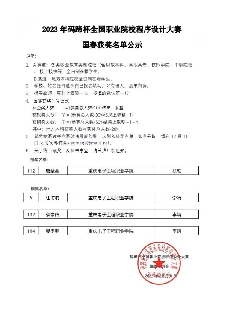 近日,由中国高等学校计算机教育研究会主办的第五届“码蹄杯”全国职业院校程序设计大赛全国总决赛成功举办。经过五个小时的激烈比拼,我校电子与物联网学院学生唐圣金斩获银奖,江侑航、蔡宗佑、晏李鹏3名学生斩获铜奖。