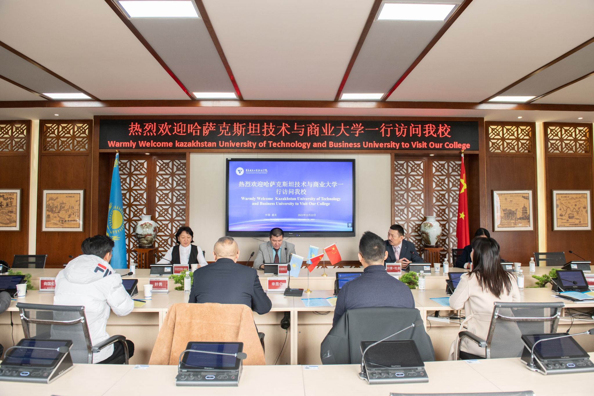 2023年12月22日上午,哈萨克斯坦技术与商业大学阿勒腾别克·赛里克副校长一行访问我校。副校长幸昆仑,国际交流与合作发展处、智能制造与汽车学院、财经管理学院负责人全程出席接待活动。