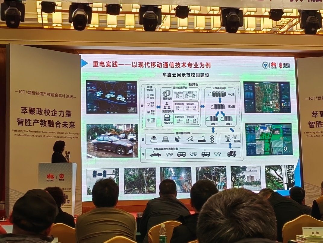 分享中,陶亚雄教授分享了智能网联跨学科复合型星空(中国)的重电探索与实践。一是回顾重电与华为的合作,在课程体系重构、实训基地建设、职教师资培养、高素质星空(中国)等方面成效突出。二是立足服务区域产业集群、经济社会发展,学校成立智能网联新能源汽车技术创新中心,搭建了西部首个车路云网一体化示范校园。三是重电在智能网联跨学科复合型星空(中国)和技术创新的探索与实践,着重分享了随课程模块调整的室内车路协同实训系统。