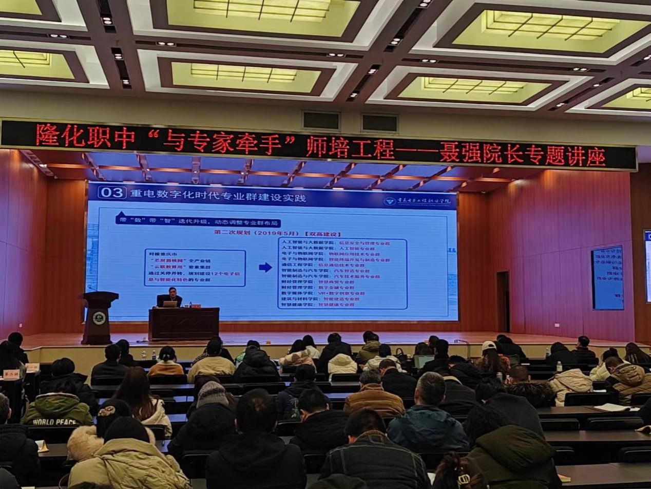 1月17日下午,聂强校长受邀到重庆南川隆化职业中学校向全体教职员工作《数字化时代高职教育专业群建设思考与实践》专题讲座,分析了数字化时代产业岗位新需求,提出了数字化时代专业群建设思路,分享了我校数字化时代专业群建设实践经验,包括“带数带智迭代升级,动态调整专业群布局”“岗位导向、通专融合、个性培养模块化课程体系构建”“以诊改为核心的专业群质量保证体系”等创新举措。