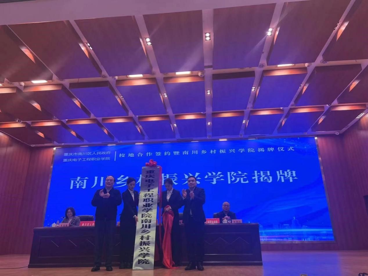 讲座结束后,学校与南川区人民政府举行了校地合作签约暨南川乡村振兴学院揭牌仪式。签约和揭牌仪式由南川区人民政府副区长李玉梅主持,聂强校长代表我校与南川区人民政府签署校地合作协议,与南川区人民政府区长施崇刚共同为“南川乡村振兴学院”揭牌。副校长幸昆仑、国际交流与合作发展处处长刘宏宇、科研与社会服务处副处长王荣辉、智慧健康学院副院长李卉、党政办文秘机要科负责人陈洲、教师代表杨静、冯琪翔,代表重庆电子工程职业学院出席了本次活动。出席该活动的还有南川区教委、区乡村振兴局、区人力社保局、区农业农村委、区商务委、隆化职中等单位负责人,以及隆化职中全体教职工。会上,聂强校长、施崇刚区长分别发表致辞,表示通过共建乡村振兴学院,加强校地合作,落实党中央乡村振兴决策部署,助力南川区经济社会快速发展。