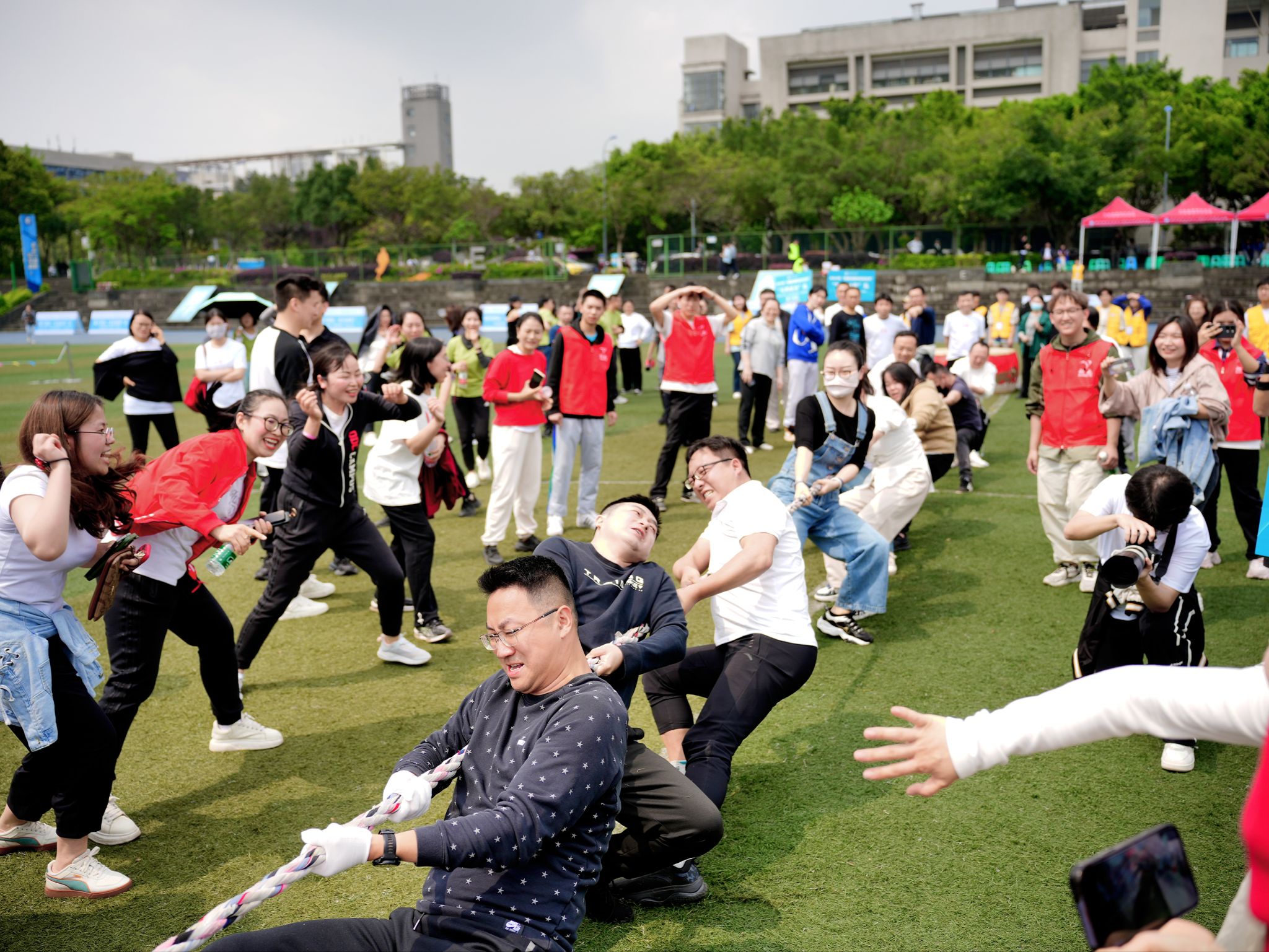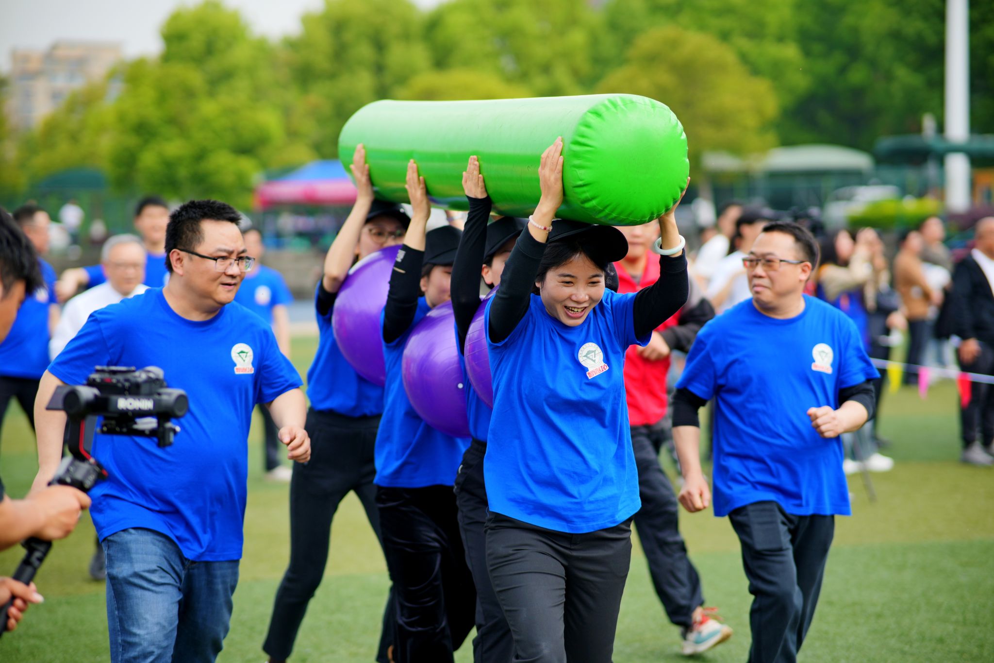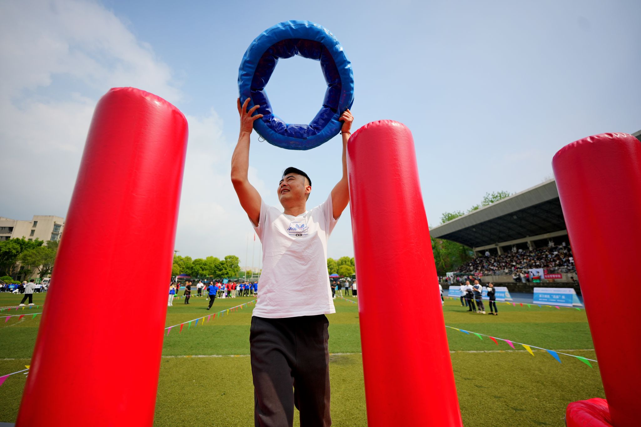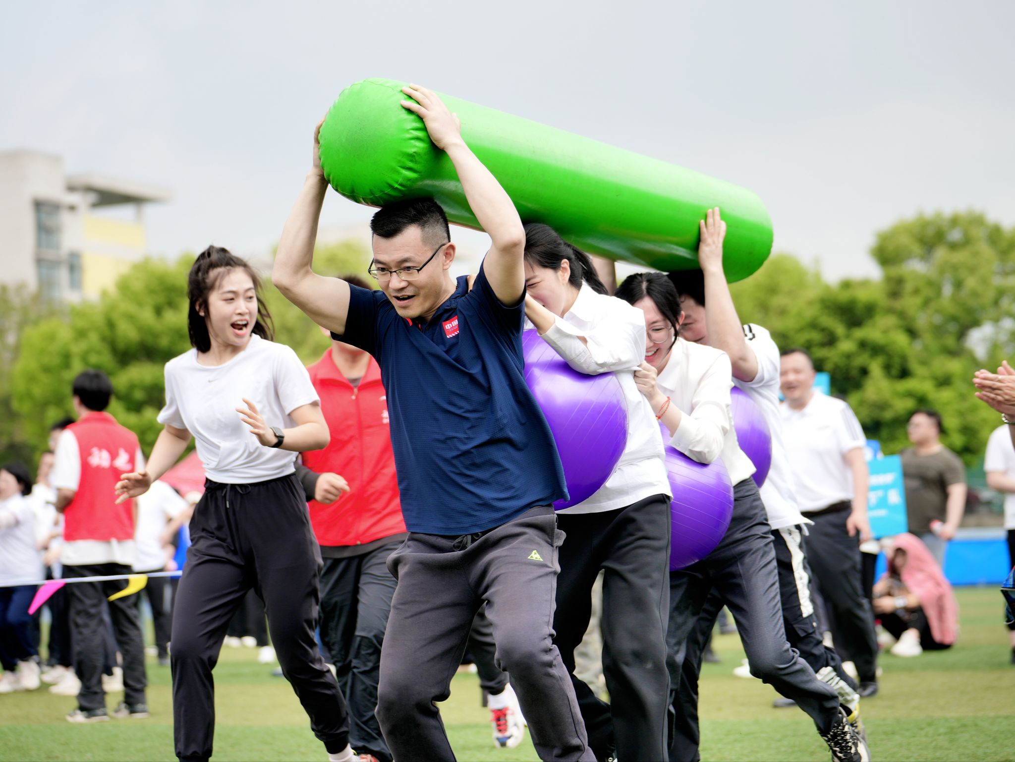 体操展示环节结束后,教职工们积极地参与了各个项目,在超级障碍赛、智慧汉诺塔、万众一心、多项拔河等四个项目中,欢呼声此起彼伏,教职工们活跃的比赛热情洋溢在操场上。