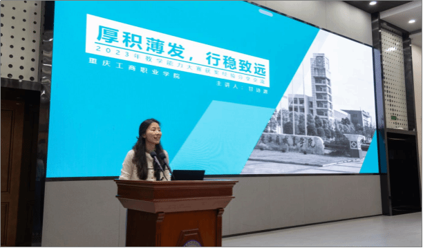 其次,重庆市教育科学院教研员付勇对2023年教学能力比赛市赛和国赛情况进行了总结和剖析。从市赛的参赛规模、作品分布、市赛获奖覆盖面、国赛获奖率,再到作品特色、赛事组织等方面进行了全面总结;然后,对参赛作品中存在材料缺乏政策支撑、团队自信心不足、育人主线和学习主线不清晰、材料逻辑不严谨、作品创新特色不鲜明、团队教学风格不鲜明等问题进入了深度剖析;最后,对教师们提出四点希望:“以赛铸德,理实并进,坚定教师职业信念”“治理赋能,强化规范,培养教师精湛业务”“聚焦五金,产教融合,打造教师创新团队”“以赛促研,科教融汇,提高教师学术能力”。