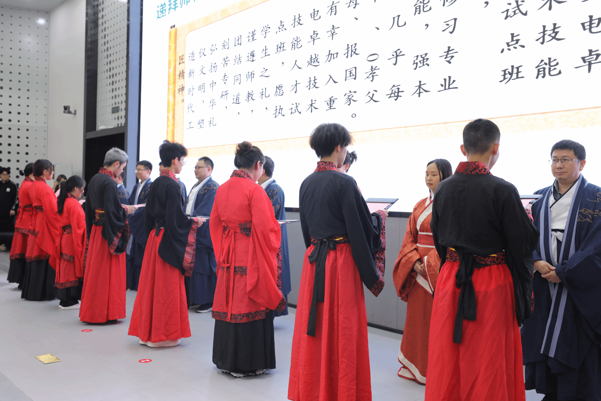 本次重电工匠礼包括祭拜先师孔子、致敬重电工匠大师、卓越班工匠拜师礼三个流程,通过传统拜礼、递呈拜师帖、聆讯、赠六礼束修、敬茶束发、击鼓启志和诵读明志等环节,让重电技能大师和技术技能学习者,在课堂教学之外,得以用仪式感构建师徒关系、端正专业技能学习态度,达成教与学的精神契约。