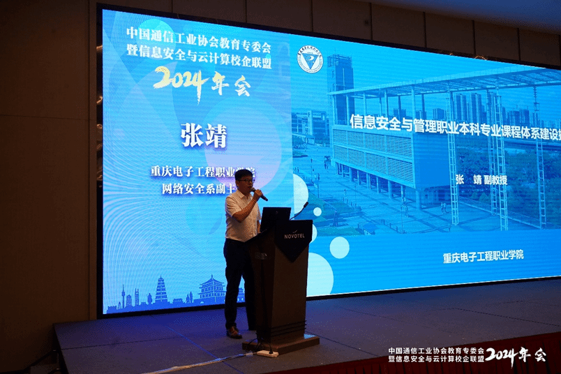 接着,本次年会继续围绕应用型本科院校、职业本科院校和高职院校的国家团队建设、职教本科专业建设、职业教育新专业开发等热点话题展开了深入讨论。会上,重庆电子工程职业学院网络空间安全系副主任张靖教授就信息安全与管理职业本科专业课程体系的建设发表了独到见解。张教授深入探讨了构建高效课程体系的重要性,并着重强调了专业基础课程与职业岗位课程之间的逻辑联系,表示“注重提升培养职业岗位技能的内涵深度,自主学习、创新和解决复杂问题的能力”。