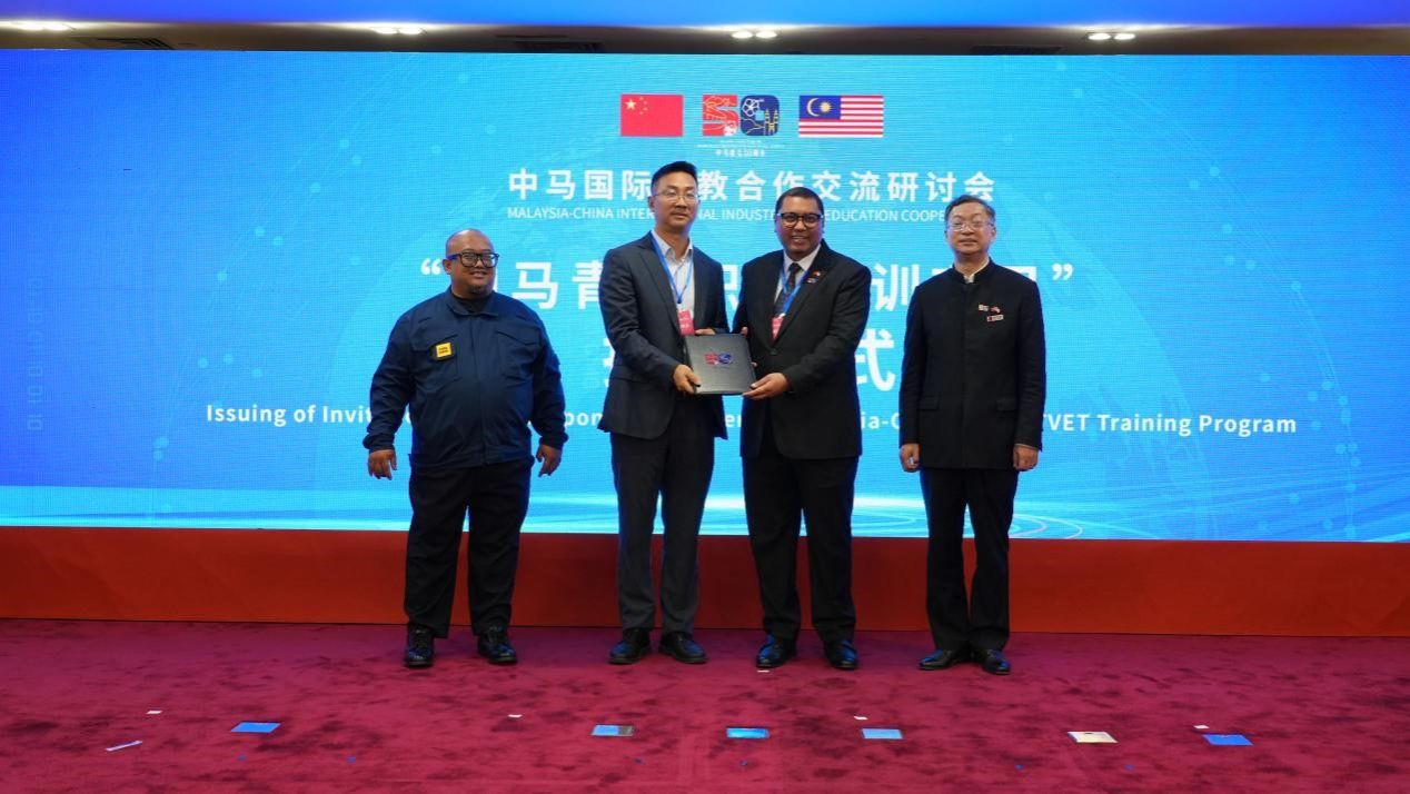 会上马来西亚议员、全国职业工友会顾问莫哈末·沙布丁为我校颁发“中马青年职教培训计划”授函,学校将为马来西亚青年提供新一代信息技术领域的职业培训。