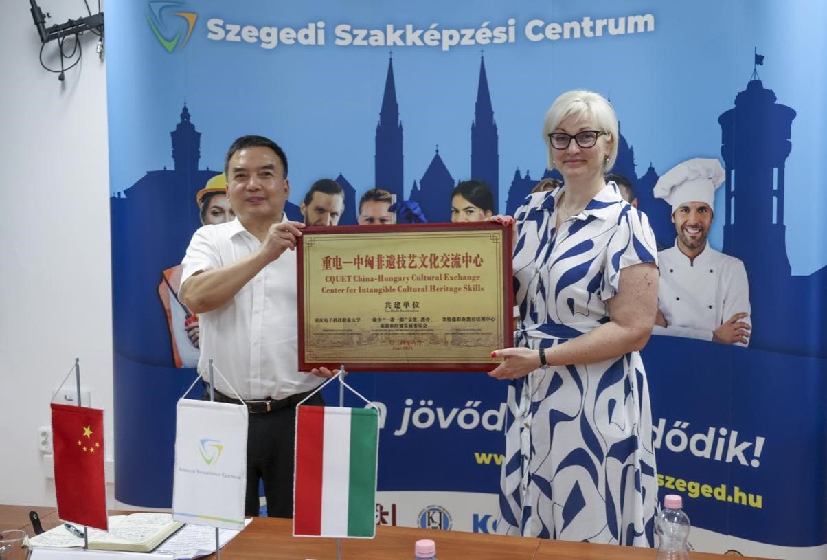 在匈牙利塞格德职业教育培训中心会议厅举行了“重电-中匈非遗技艺文化交流中心”揭牌仪式。非遗技艺是中匈两国文化的瑰宝,交流中心的建立将为中匈两国的非遗传承和文化交流搭建起重要的桥梁。