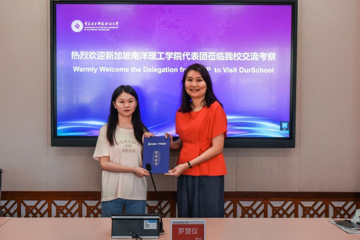 随后,与会嘉宾就重庆职业教育的发展进行了热烈的讨论与交流。同时,新加坡南洋理工学院副校长罗楚仪教授亲自主持证书颁发仪式,为曾经参与过新加坡南洋理工学院研修班的4名重电学生颁发了结业证书。这一时刻不仅是对学生们辛勤付出的肯定,更是对两校教育合作成果的具体体现。