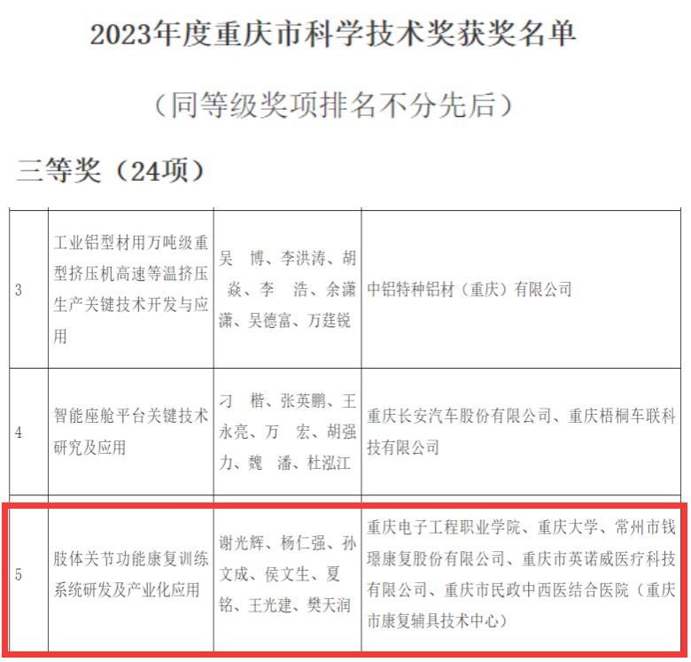 8月19日,重庆市科技创新大会召开,2023年度重庆市科学技术奖正式揭晓,本年度共有98项科技成果获得奖励。其中,以我校智慧健康学院谢光辉教授团队主持完成的成果《肢体关节功能康复训练系统研发及产业化应用》获得科技进步三等奖,是重庆市职业院校牵头的唯一获奖成果。该成果为我校近3年来连续主持获得的第5项重庆市科学技术奖,同时,也是该团队继主持获重庆市科技进步二等奖(2022年)、重庆市首届优秀专利奖(2023年)后的第三项科技创新标志性成果。