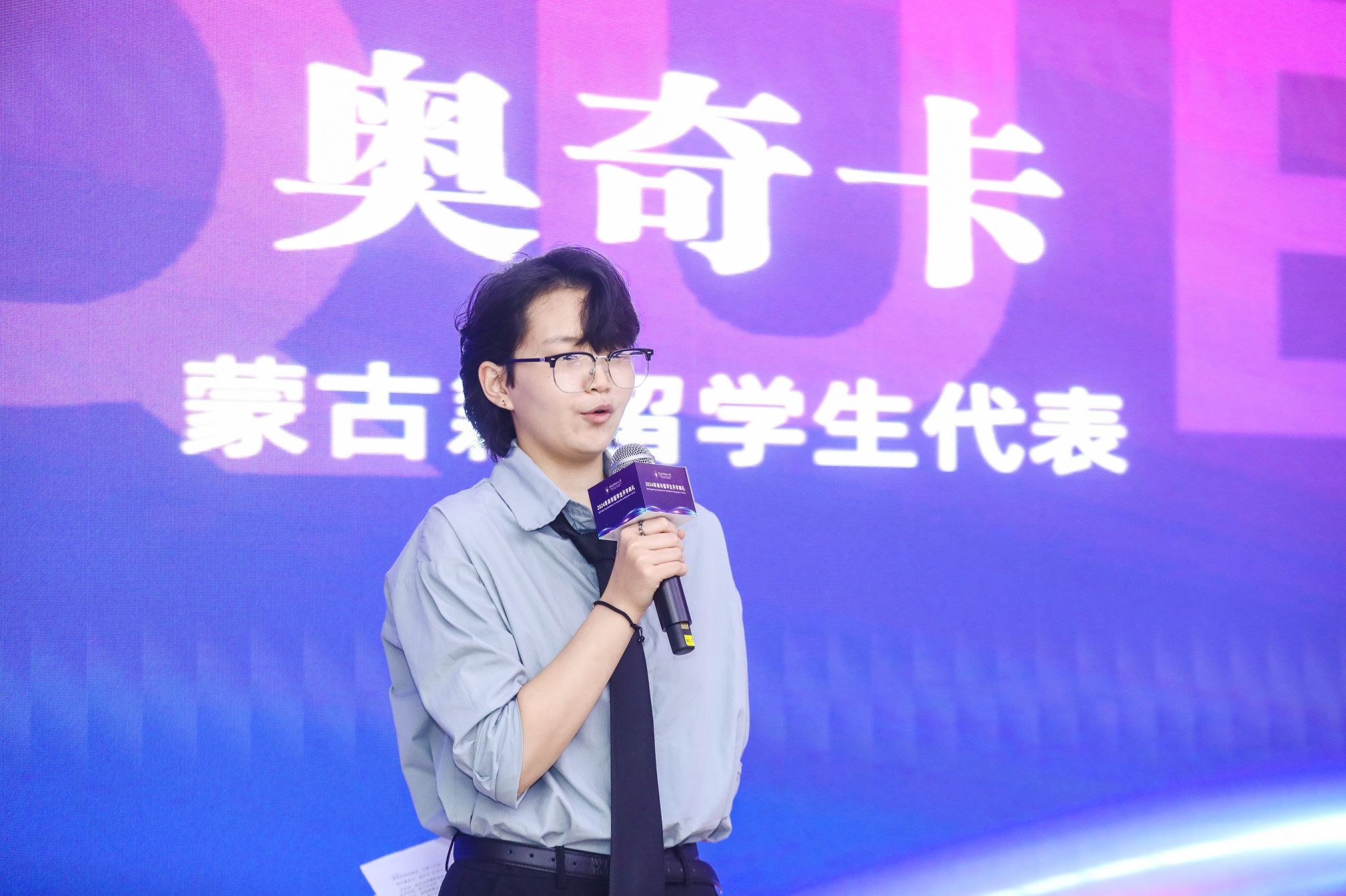 紧接着,蒙古籍留学生代表奥奇卡上台发言。她感谢学校为留学生创造的优越学习生活条件,并表示将珍视留学机会,加强专业学习,深入探索中国文化,不断提升精神境界。奥奇卡还分享了个人的留学感悟与收获,满怀对未来的美好期望。
