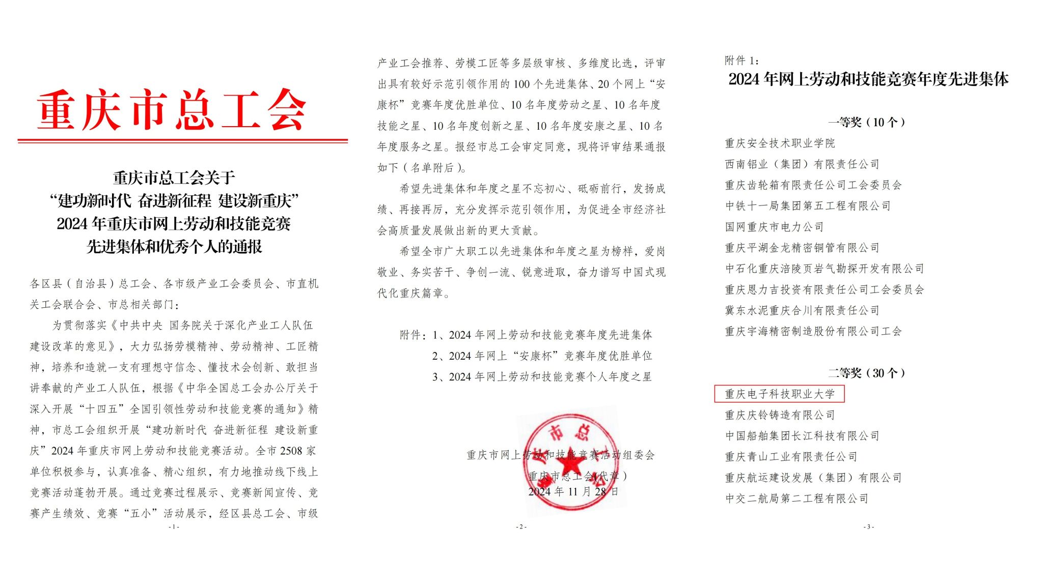12月4日,重庆市总工会发布通报,对2024年重庆市网上劳动和技能竞赛先进集体和年度之星予以了通报表彰。我校被评为重庆市总工会“2024 年网上劳动和技能竞赛先进集体”二等奖。