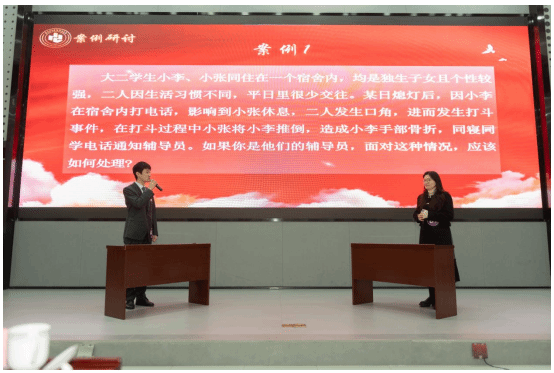 本次辅导员素质能力大赛现场赛分成案例研讨和谈心谈话两个环节,案例研讨重点考察辅导员的政治理论素养和工作业务知识以及综合运用理论分析问题、研判问题、解决问题的能力。比赛以“我提问,你回答”的方式开展,由AB选手围绕案例共同辨析原因、研讨对策、总结规律。