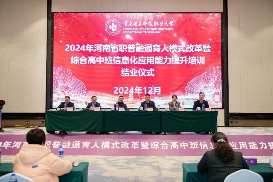 为期5天的2024年河南省职普融通育人模式改革暨综合高中班信息化应用能力提升培训班于12月22日-26日在两江校区举行,河南省教育厅职业教育与成人教育处处长张家成、副处长刘娜;我校副校长刘成俊,人工智能与大数据学院院长武春岭,教育部国培(重电)基地办主任、职教师资培训学院书记兼院长莫绍强,基地办副主任张亚参加了25日举行的结业式。