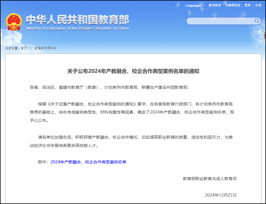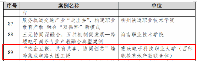 近日,教育部根据《关于征集产教融合、校企合作典型案例的通知》要求,经过严格的资格审查和专家评议程序,公布了全国133个产教融合、校企合作典型案例。我校申报的《“校企互嵌,共育共享,协同创芯”培养集成电路大国工匠》案例成功入选。