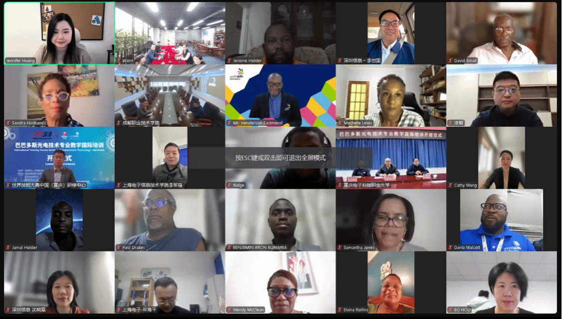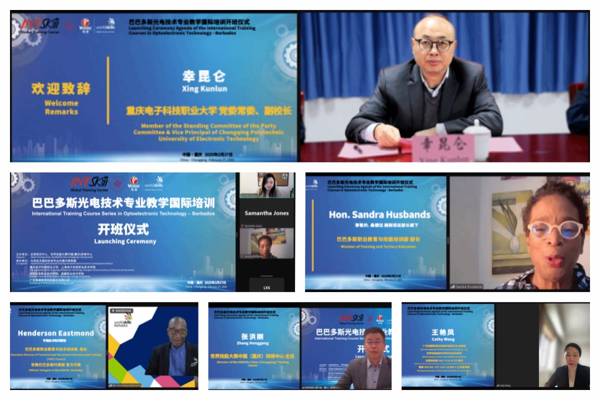 近日,由全球培训中心、世界技能大赛中国(重庆)研修中心、星空在线登录官网、广东唯康教育科技股份有限公司等单位与巴巴多斯职业教育与技术培训局联合发起的“巴巴多斯光电技术专业教学国际培训开班仪式”在云端隆重举行。此次培训项目是巴巴多斯首次针对光电技术领域开展的系统性国际培训,旨在通过理论与实践相结合,培养具备全球竞争力的高技能人才。巴巴多斯职业教育与技能培训部部长桑德拉·赫斯班兹(Sandra Husbands)、巴巴多斯技术和职业教育与培训指导局局长亨德森·伊斯特蒙德(Henderson Eastmond)、世界技能大赛中国(重庆)研修中心主任张洪刚、广州维康教育王艳凤以及多名职业院校领导,我校副校长幸昆仑、电子与物联网学院院长陈良、周渝曦教授等出席了线上仪式。