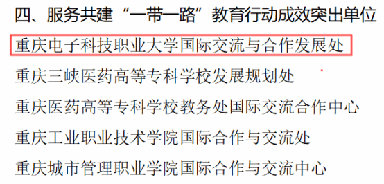 近日,重庆市教育委员会发布《关于表扬2024年教育对外开放工作成效突出单位的通报》,我校国际交流与合作发展处荣获“服务共建‘一带一路’教育行动成效突出单位”称号。这一荣誉充分彰显了我校在服务国家“一带一路”倡议、推动教育国际合作与交流方面的显著成效。