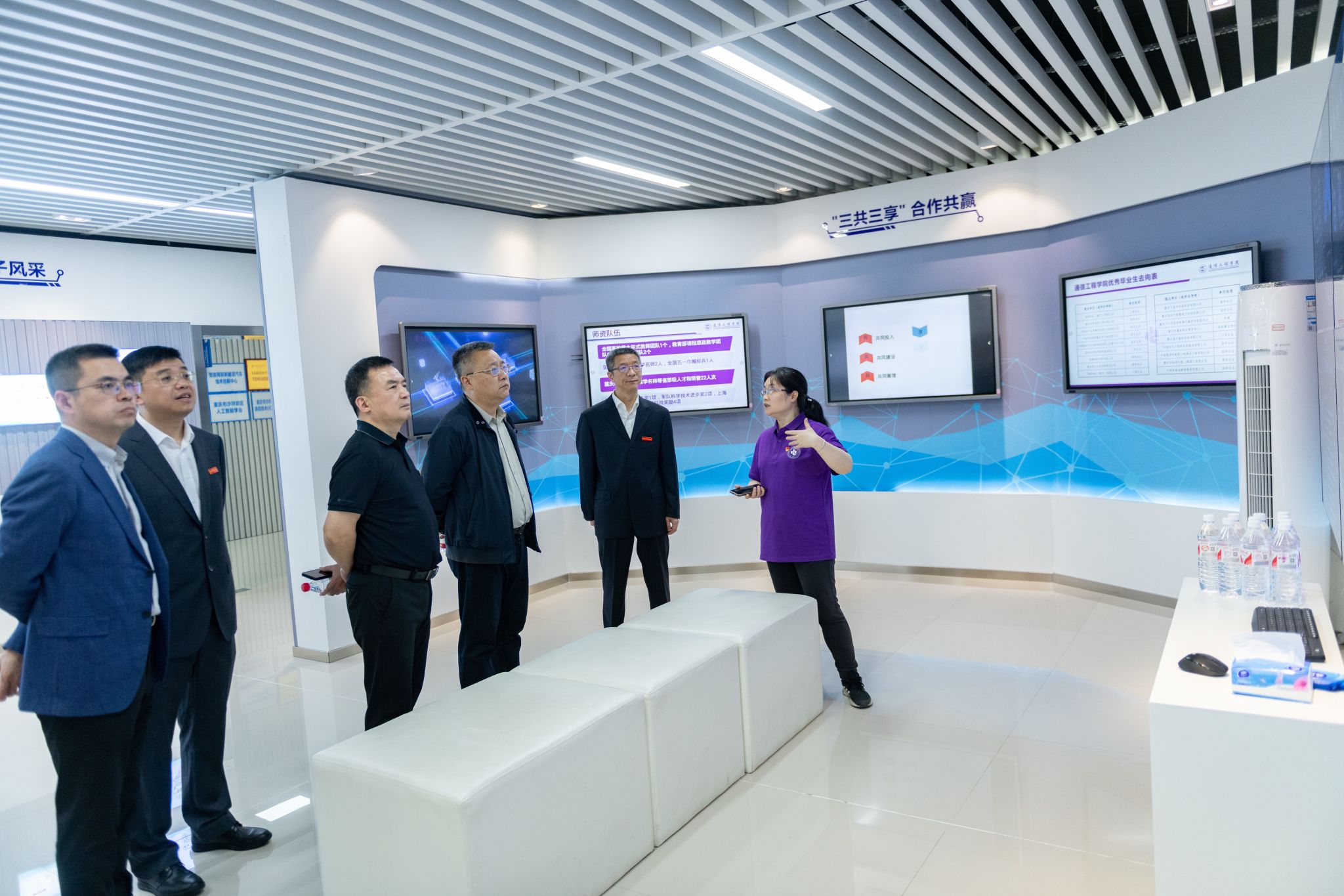 章榕一行先后调研走访了学校校史陈列展览馆、建筑与材料学院、人工智能与大数据学院、通信工程学院、电子与物联网学院、通识学院与国际学院国学馆,深入了解了学校六十年办学历程,对学校在全面从严治党、党风廉政建设、科教融合、产教融汇、人才创新等方面取得的成绩给予了充分肯定。