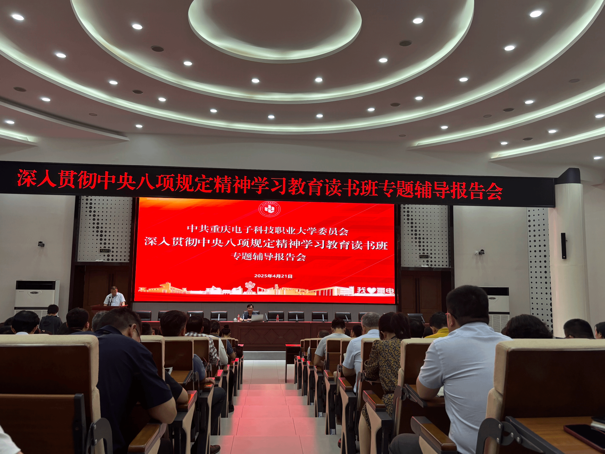 4月21日,学校举办深入贯彻中央八项规定精神学习教育读书班专题辅导讲座。中共重庆市委党校、重庆行政学院中共党史教研部主任高广景教授作专题辅导,学校党委常委、副校长刘洪光主持,全体在家校领导、全体处科级干部、全体专职组织员聆听了本次讲座。