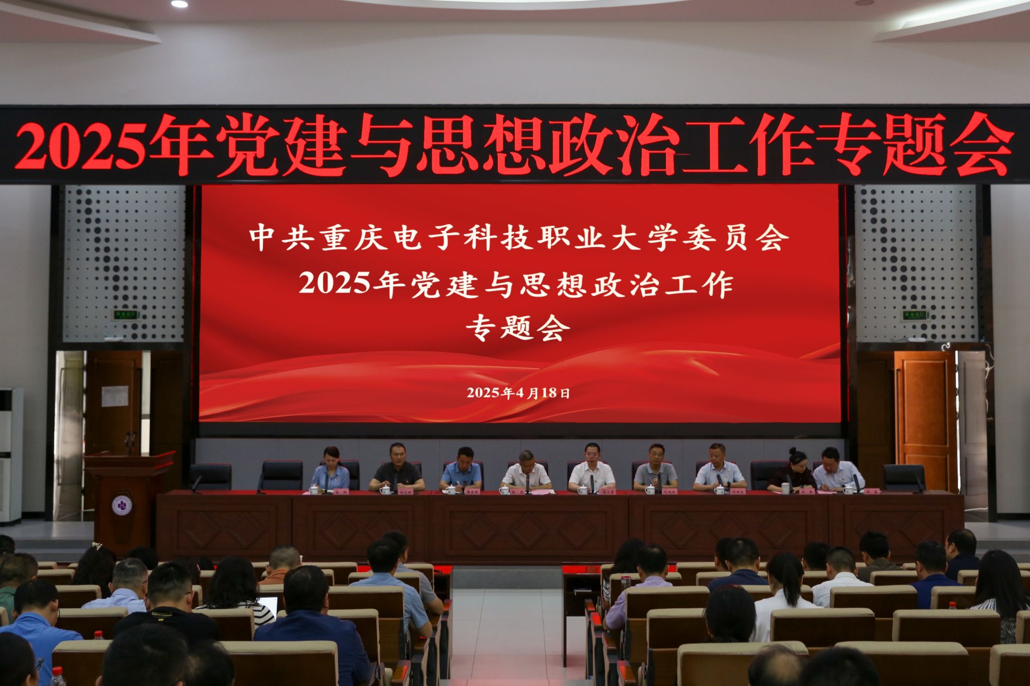 2025年4月18日上午,学校在博远厅召开2025年党建与思想政治工作专题会,全体在家校领导、处级领导干部、专职组织员(纪检监察员),二级学院党政科、学管科、团总支、教学与课程思政管理科科长,党支部书记代表、辅导员代表、思政课教师代表,党口职能部门和校团委全体科级干部参加会议。会议由党委副书记龚小勇主持。