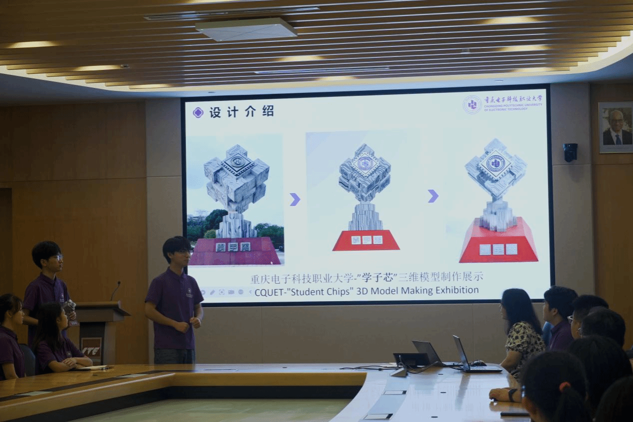研学尾声,重电学子们精心策划并举办了一场结业汇报演出。技能交流环节,重电学子展现了卓越的综合素养。智能制造与汽车学院学生王凯、电子与物联网学院学生白馨宇等同学打破学科壁垒,跨学科融合3D打印、PCB等多项技术技能,共同设计制作了一款“学子芯”3D雕塑,作为综合课程设计作品,得到了新加坡工艺教育学院访学项目全体教师的高度认可和一致好评。文艺汇演环节,“福到了”书法体验、重庆话-南阳英语的“方言传话”等活动,也也将本次访学的人文交流推向了新高度。