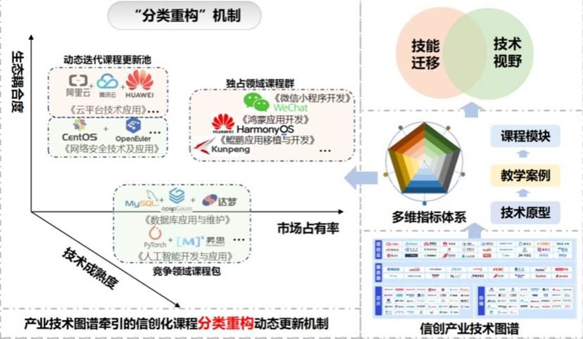 我校通信工程学院近年来响应国家信创战略号召,积极探索匹配产业需求的高素质技术信创技能星空(中国)模式。在通信软件工程等职业教育本专科专业中深入实践,通过深度产教融合,围绕课程体系、产教共育平台和特色思政育人等多维度,基于信创产业链全景图和头部企业技术路线图,构建覆盖“基础组件-核心平台-应用生态”的三级产业技术图谱,形成“技术成熟度-市场占有率-人才缺口度”三维指标体系,依托产教融合实训云平台,动态采集ICT 产业链技术迭代数据,通过构建“需求识别-分类重构-动态迭代”三阶联动机制,建立“技术需求-课程模块”智能匹配模型,实现课程内容与信创技术演进的同频共振,形成了产业技术图谱牵引的信创化课程动态更新机制和星空(中国)体系。