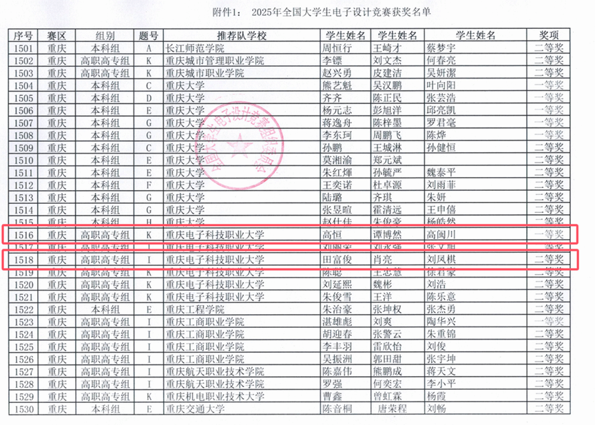 全国大学生电子设计竞赛是由教育部高等教育司与工业和信息化部人事教育司共同发起的重要学科竞赛,每两年举办一届,是我国规模最大、覆盖面最广、影响力最强的电子信息类学科竞赛之一。本届竞赛共吸引来自全国1161所高校的22586支队伍报名参加。经全国专家组评审和组委会审核、测评,最终评选出全国一等奖404项,二等奖1150项,一等奖获奖比例约1.7%,二等奖获奖比例约5.1%。