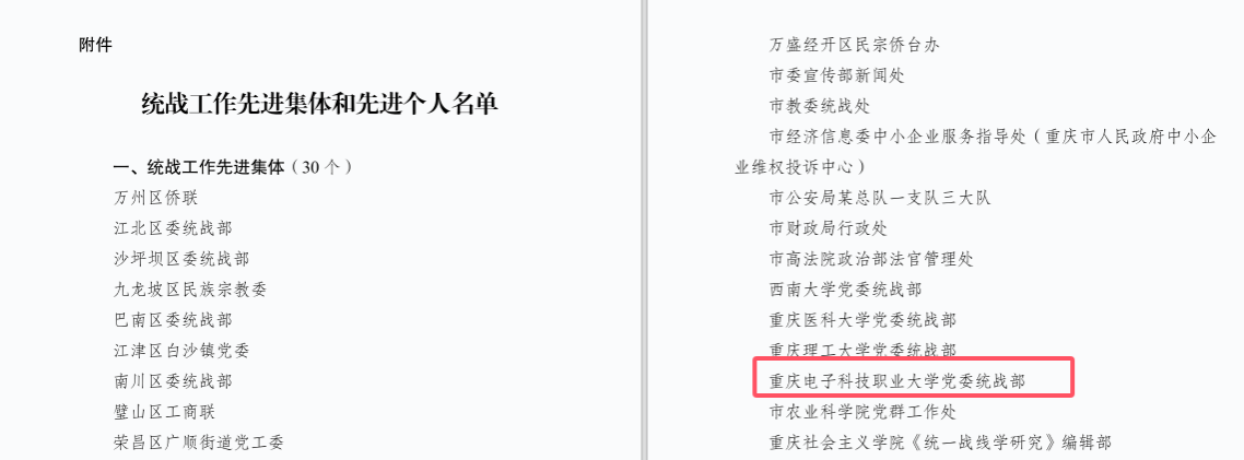 近日,重庆市人力资源和社会保障局与市委统战部联合印发渝人社〔2025〕358号文件,正式授予我校党委统战部“重庆市统战工作先进集体”荣誉称号,标志着我校统战工作成效获得市级层面的权威认可。