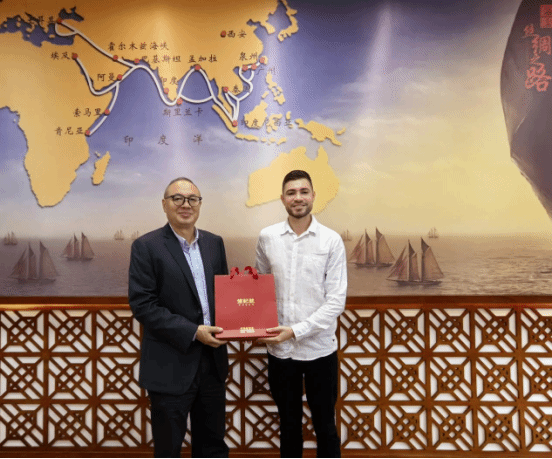 仪式现场,幸昆仑为哥伦比亚国家培训服务中心学生代表佩戴校徽,象征着两校友谊的不断深化。双方还互赠了具有地域特色的纪念品,代表了中哥文化的交融互鉴。