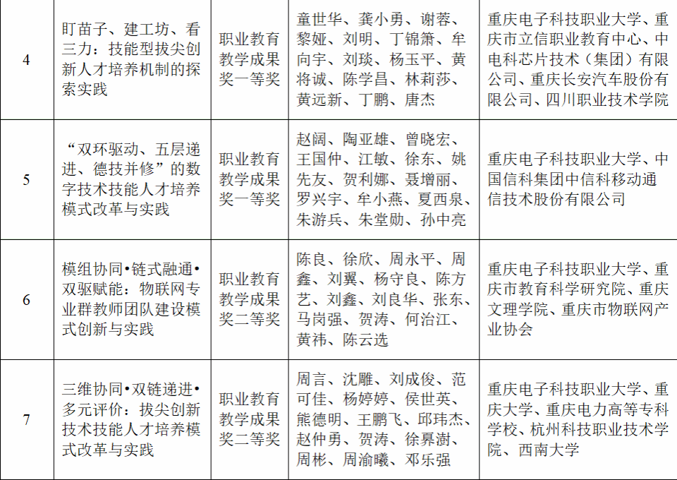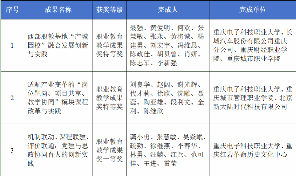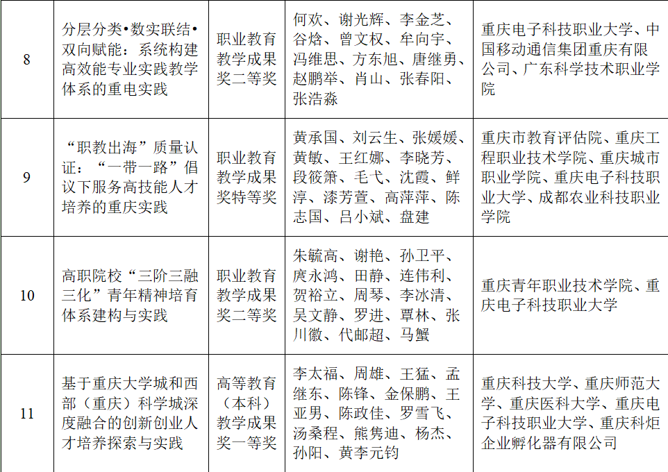 近日,重庆市人民政府发布《关于2025年重庆市教学成果奖励的决定》(渝府发〔2025〕17号),我校共荣获市级教学成果奖11项。其中,作为第一完成单位荣获职业教育教学成果奖8项,包括特等奖2项、一等奖3项、二等奖3项,获奖数量居重庆市职业院校首位;另作为主要参与单位获教学成果奖3项,包括职业教育教学成果特等奖1项、二等奖1项及高等教育(本科)教学成果一等奖1项。