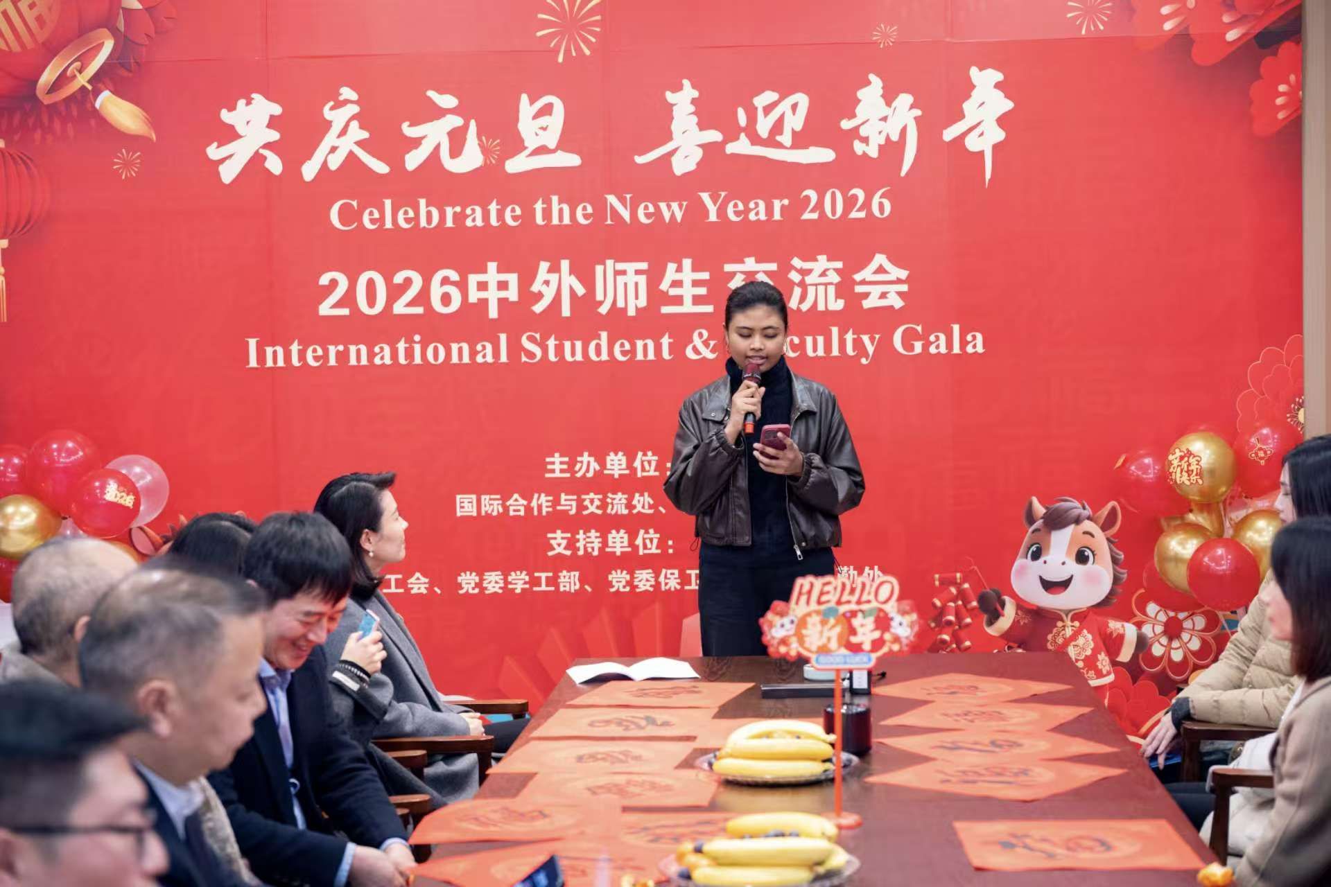来自马达加斯加的留学生代表刘夕苒同学用流利的中文发言,她分享了在中国学习的收获与感动,感谢学校为留学生提供的优质学习平台和温暖关怀,并表达了对新年新征程的憧憬与信心。