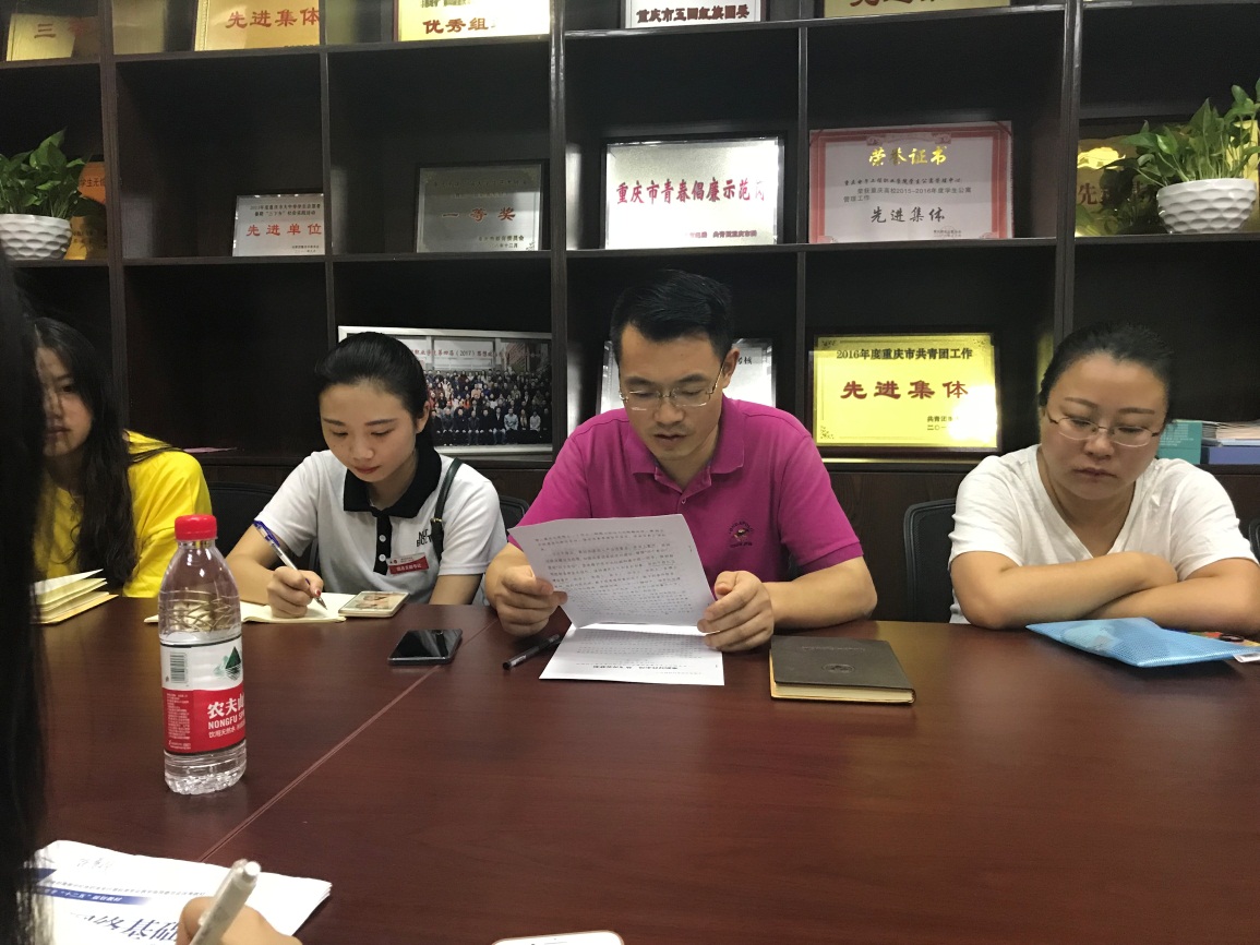 会上,袁玉刚书记带领所有成员学习了习近平总书记同团中央新一届领导班子成员集体谈话重要讲话全文以及王沪宁在团的十八大会上的致词。随后,袁书记强调今后我校开展共青团工作指导思想是“党建带团建,党旗所指,团旗所向,党有政策、团有行动”。共青团一定要当好党的助手和后备军。要切实落实从严治团,加强共青团系统党的组织建设,坚决维护以习近平同志为核心的党中央的权威和集中统一领导,勇于“担担子、扣扣子、钉钉子”。要积极联系与服务青年,维护青年权益,例如我校通信工程学院青志提供爱心伞的服务可以进一步加强。要在科技攻关、创新创业、精准扶贫、社会服务等方面,发挥广大青年师生的重要作用。另外,今年暑期“三下乡”学校将会有9支队伍分赴全市各地开展社会服务工作,学校要求团学青年要拓宽服务的领域,为服务重庆“两点”“两地”“两高”战略发展贡献青春力量。