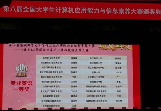 5月27日,第八届全国大学生计算机应用能力与信息素养大赛在中央民族大学圆满落幕。我校人工智能与大数据学院朱堂勋、李俊翰、刘川三位老师指导的参赛学生智能手机专业1701班丁小宁同学获计算机专业英文赛项一等奖。
