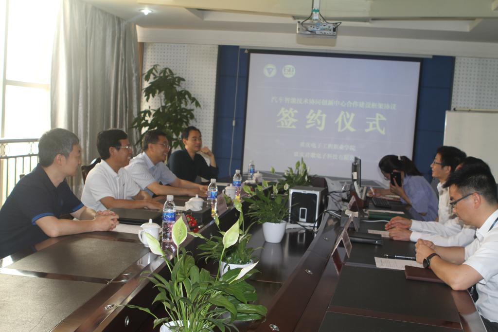 在与会领导和大家的见证下,王正勇教授和李丹总经理分别代表校方和企业签署了汽车智能技术协同创新中心框架协议,并为汽车智能技术协同创新中心揭牌。会后,李丹总经理带领大家参观了汽车电子产品生产车间、相关实验室和展厅。