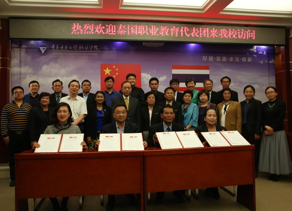 最后,刘成俊副校长代表学校与民武里技术学院、曼谷职业教育中心、北京唐风汉语教育科技有限公司四方签订了《“一带一路”职业教育国际合作框架协议》并合影留念。民武里技术学院将作为我校的姊妹校负责对接曼谷13所职业院校资源并意向确定在该校设立重电国际(泰国)分校。