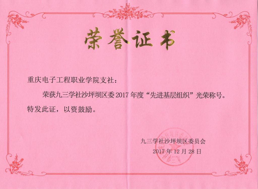 2018年1月6日,在九三学社沙坪坝区委七届五次全委(扩大)会议上,重庆电子工程职业学院支社因2017年度工作成绩显著、表现突出,被授予九三学社沙坪坝区委“先进基层组织”称号,支社社员廖小林、林涛被评为九三学社沙坪坝区委2017年度“优秀社员”。