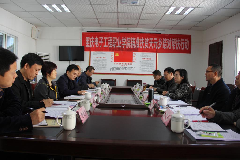 11月4日上午,由天元乡党委副书记杨成明同志主持召开了精准扶贫座谈会。会上,天元乡党委书记杨文学同志为到场领导及参会人员详细介绍了天元乡基本乡情,前期脱贫攻坚工作进展及所遇到的困难。天元乡脱贫攻坚指挥部办公室联络员刘宏伟同志介绍了驻乡工作队的工作开展情况。巫溪县教委主任许正国讲话中谈到希望社会各界出点力,帮助天元乡修路建桥,并扩大到全县贫困乡镇开展校企合作,校地合作和信息化建设等。聂强校长谈到,我校开展天元乡精准扶贫工作是坚决贯彻十九大报告精神和遵照市委、市教委的统一要求,也是我校党委行政和全校师生以及我校校友企业家团队义不容辞的责任。聂校长表示我校此行调研后,将根据天元乡的实际需求,结合校友企业家团队的优势力量,全力落实结对帮扶工作,并把扶贫工作一直持续开展下去,让天元乡人民与全国人民一道脱贫致富。会上,我校校友企业家团队就农产品电商销售,大数据信息,生态农业开发,水利修建,贸易流通,旅游产品开发等方面工作积极献言献策,并表示积极深入实地调研,寻找扶贫措施。最后县委常委、统战部部长王芳同志代表县委县政府对聂强院长一行表达真挚感谢,并希望天元乡能与重庆电子工程职业学院建立有效的帮扶机制,签订相关长期帮扶框架协议。