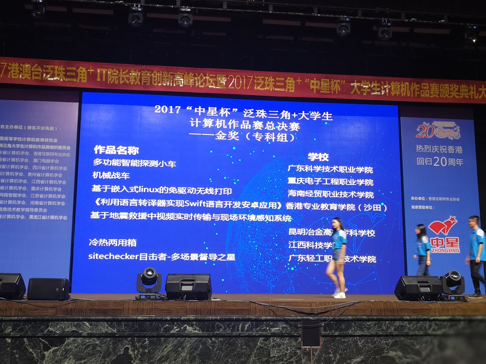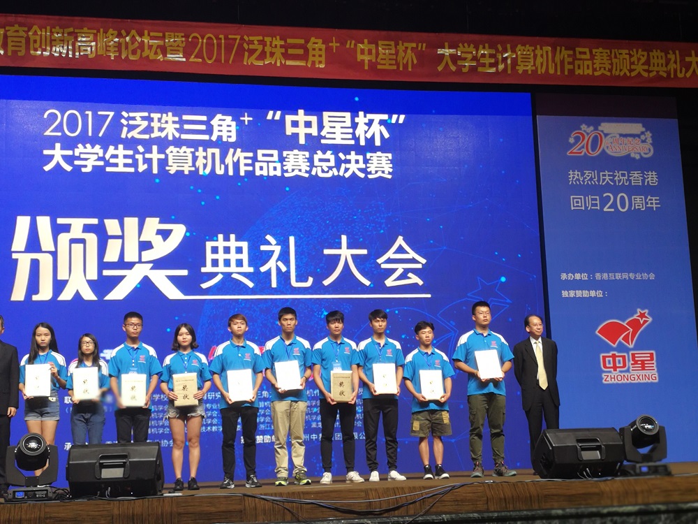 泛珠三角+“中星杯”大学生计算机作品赛是由广东省计算机学会发起,港、澳、台及大陆海峡两岸暨香港、澳门协同参加的重大赛事,是纪念香港回归二十周年系列活动之一。参加本次大赛颁奖典礼的全国嘉宾1千多人,香港政府信息科技总监太平坤士杨德斌先生,香港互联网专业协会副会长洪文正先生,全国高等学校计算机教育研究会副理事长朱庆生教授等领导参加了颁奖仪式并致辞,场面隆重而恢弘。